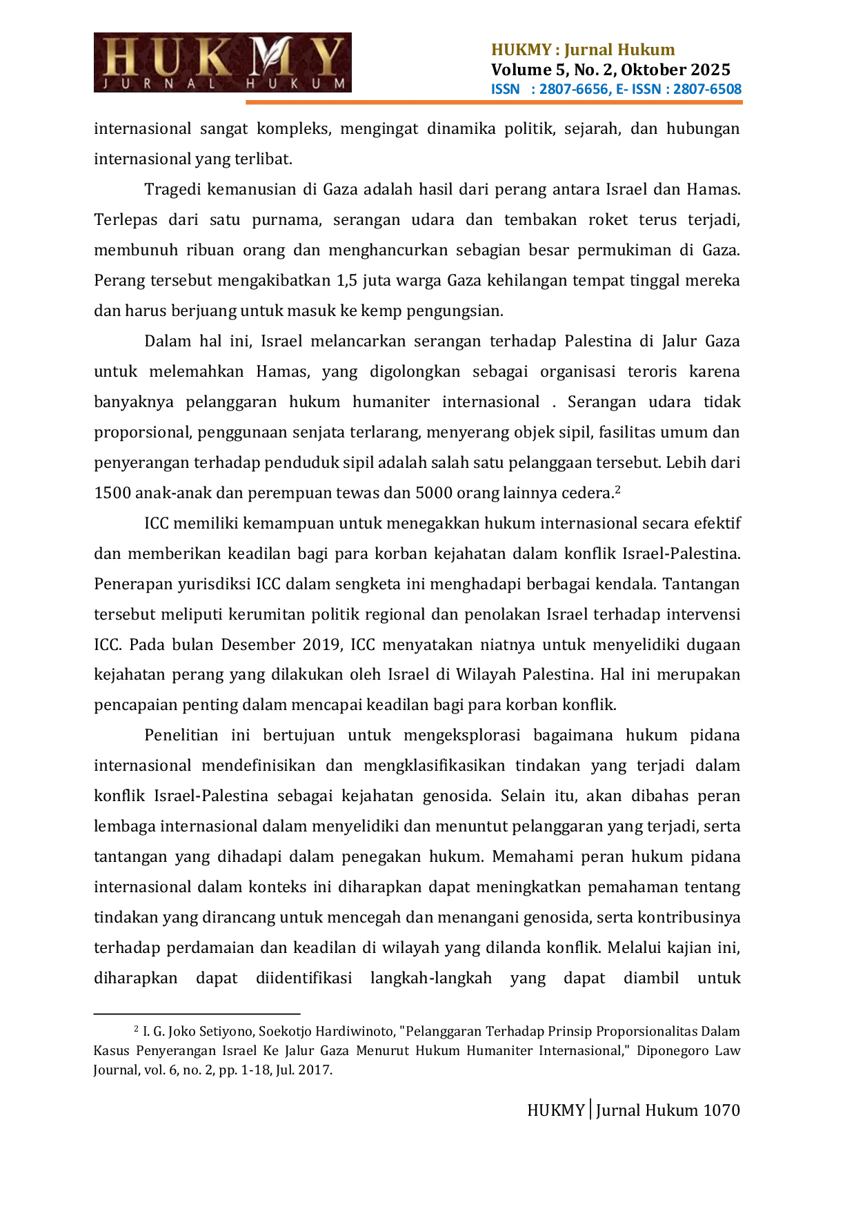 HUKMY : Jurnal HukumHUKMY : Jurnal HukumDalam mengatasi genosida yang terjadi dalam konflik Israel-Palestina sangat dibantu oleh hukum pidana internasional, terutama melalui mekanisme pengadilan seperti Mahkamah Pidana Internasional (ICC). Tujuan penegakan hukum ini adalah untuk menuntut mereka yang melakukan kejahatan berat, memberikan keadilan kepada korban, dan mendorong akuntabilitas di tingkat internasional. Penelitian hukum normatif ini menggunakan teknik legislasi yang memanfaatkan sumber hukum primer, sekunder, dan tersier. Penulis menggunakan tinjauan pustaka sebagai metodologi penelitian, dan pendekatan analisis dalam makalah ini bersifat kualitatif. Hukum pidana internasional, melalui instrumen seperti Statuta Roma dan peran Mahkamah Pidana Internasional (ICC), berfungsi sebagai mekanisme untuk menanggapi dan mengadili kejahatan internasional, termasuk genosida. Meskipun ICC memiliki yurisdiksi untuk menyelidiki dan menuntut pelanggaran yang terjadi, berbagai faktor politik dan hukum sering kali menghambat proses tersebut. Penelitian ini menyoroti pentingnya akuntabilitas dan keadilan bagi korban, serta perlunya kerja sama internasional untuk memastikan bahwa pelanggaran berat tidak dibiarkan tanpa sanksi. Dengan demikian, hukum pidana internasional dapat berkontribusi pada penyelesaian konflik dan pemulihan kepercayaan di antara pihak-pihak yang terlibat.