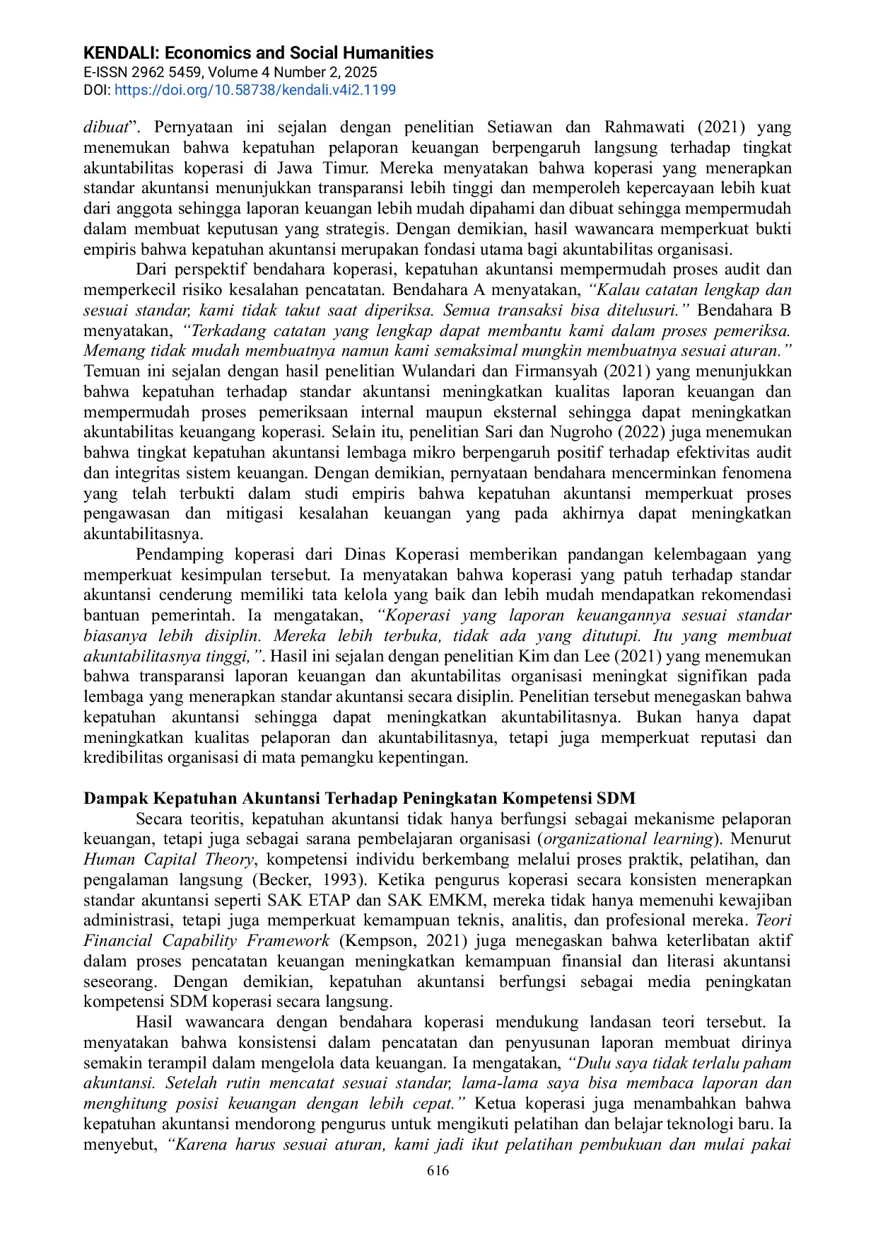 KENDALI: Economics and Social HumanitiesKENDALI: Economics and Social HumanitiesKoperasi di Indonesia masih mengalami rendahnya kepatuhan akuntansi akibat lemahnya akuntabilitas, keterbatasan kompetensi sumber daya manusia, serta faktor perilaku seperti persepsi manfaat, norma sosial, dan kontrol perilaku. Penelitian ini menganalisis pengaruh ketiga faktor tersebut terhadap kepatuhan akuntansi dengan menggunakan pendekatan kuantitatif‑kualitatif (mixed methods) serta model Theory of Planned Behavior. Hasil menunjukkan bahwa persepsi manfaat, norma sosial, dan kontrol perilaku secara signifikan meningkatkan kepatuhan akuntansi, yang pada gilirannya memperkuat akuntabilitas keuangan dan kompetensi SDM koperasi.