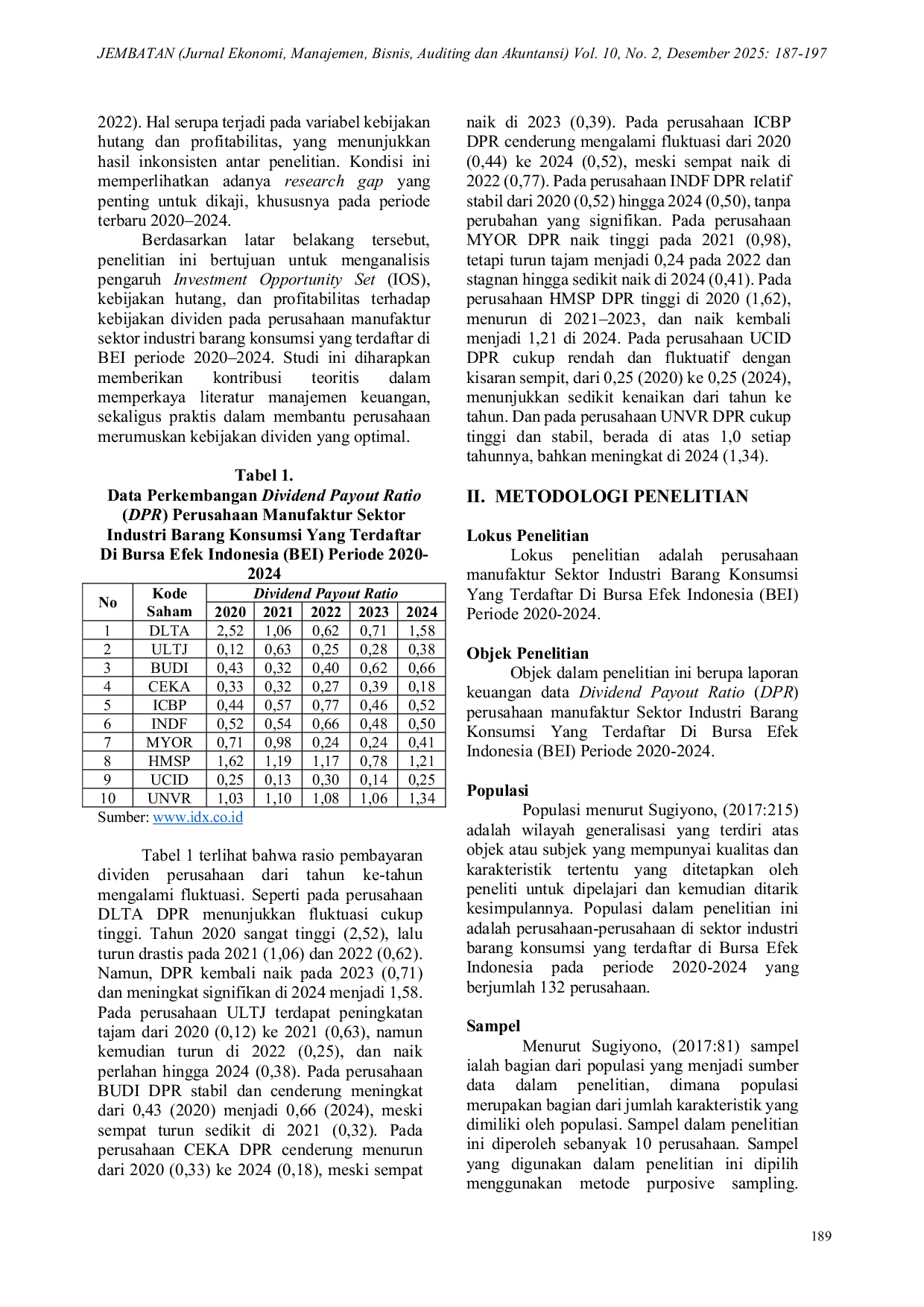 Jurnal Ekonomi, Manajemen, Bisnis, Auditing dan AkuntansiJurnal Ekonomi, Manajemen, Bisnis, Auditing dan AkuntansiKetidakkonsistenan pembagian dividen pada perusahaan manufaktur sektor industri barang konsumsi yang terdaftar di BEI periode 2020-2024 menjadi latar belakang penelitian ini. Penelitian ini bertujuan untuk menganalisis pengaruh Investment Opportunity Set (IOS), kebijakan hutang, dan profitabilitas terhadap kebijakan dividen pada perusahaan manufaktur sektor industri barang konsumsi yang terdaftar di BEI periode 2020-2024. Hasil penelitian menunjukkan bahwa secara parsial hanya IOS yang berpengaruh signifikan terhadap kebijakan dividen, sedangkan kebijakan hutang dan profitabilitas tidak. Namun, secara simultan ketiga variabel berpengaruh signifikan. Kesimpulan penelitian ini menegaskan pentingnya peluang investasi dalam menentukan kebijakan dividen.