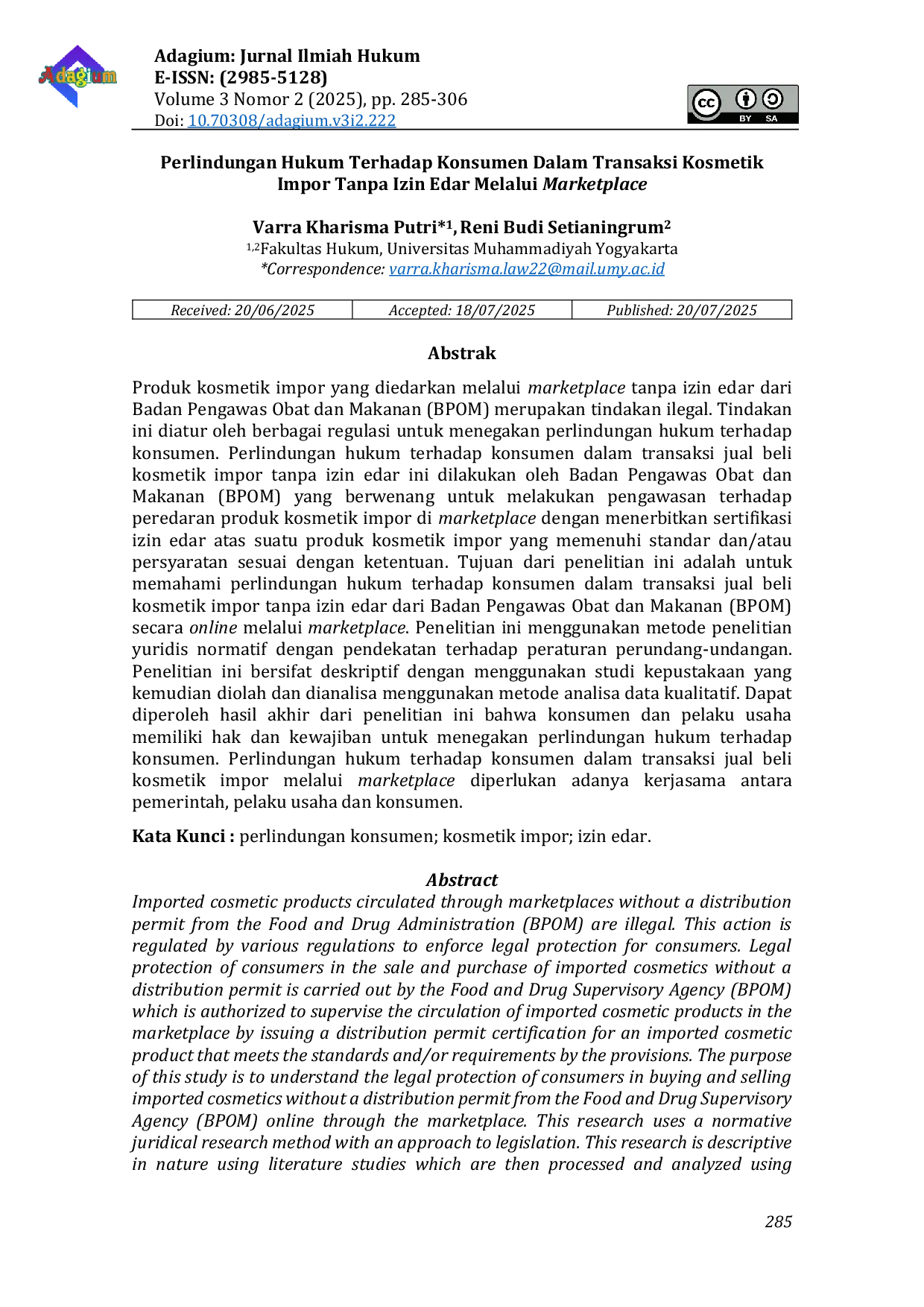 - Perlindungan Hukum Terhadap Konsumen Dalam Transaksi Kosmetik Impor Tanpa Izin Edar Melalui Marketplace... ejournal.mejailmiah.com/index.php/adagium/article/view/222Perlindungan Hukum Terhadap Konsumen Dalam Transaksi Kosmetik Impor Tanpa Izin Edar Melalui Marketplace ejournal mejailmiah index php adagium article view 222