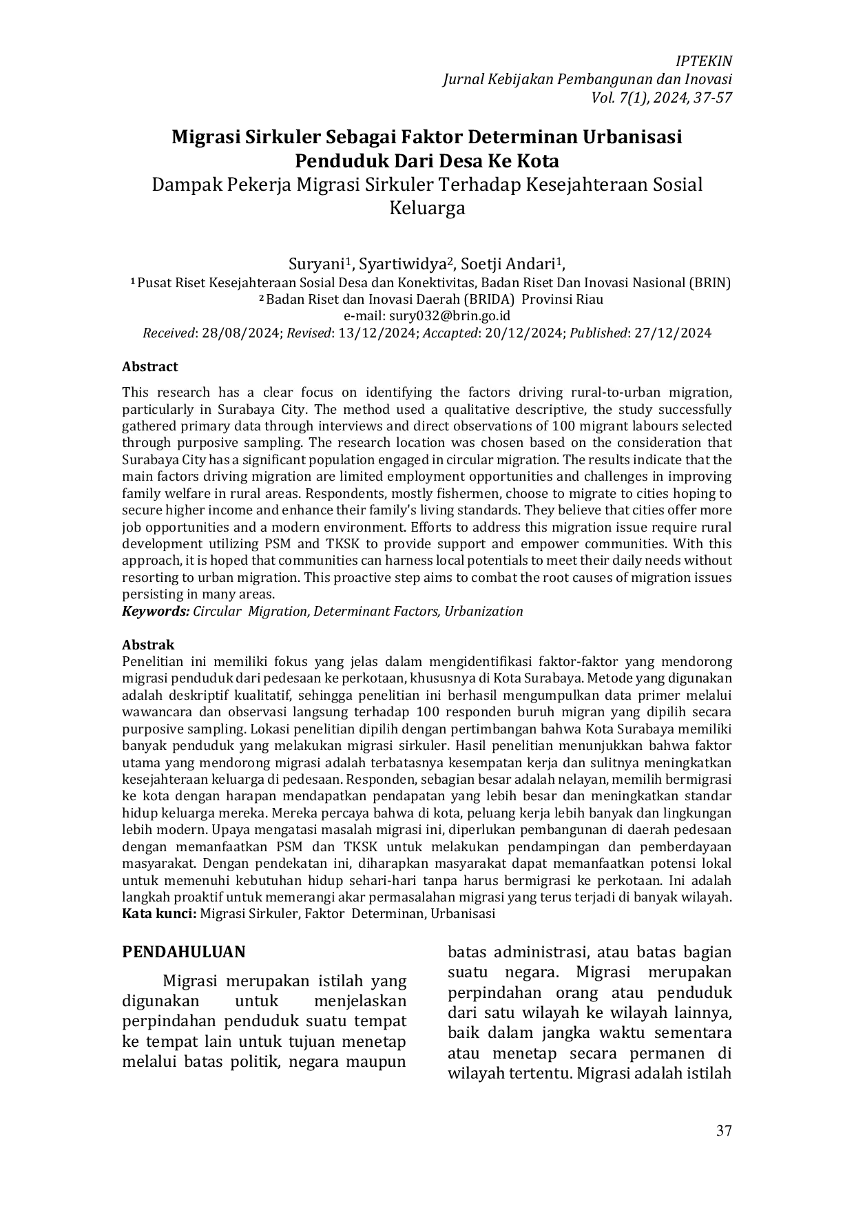 IPTEKIN Jurnal Kebijakan Pembangunan dan InovasiIPTEKIN Jurnal Kebijakan Pembangunan dan InovasiPenelitian ini memiliki fokus yang jelas dalam mengidentifikasi faktor-faktor yang mendorong migrasi penduduk dari pedesaan ke perkotaan, khususnya di Kota Surabaya. Metode yang digunakan adalah deskriptif kualitatif, sehingga penelitian ini berhasil mengumpulkan data primer melalui wawancara dan observasi langsung terhadap 100 responden buruh migran yang dipilih secara purposive sampling. Lokasi penelitian dipilih dengan pertimbangan bahwa Kota Surabaya memiliki banyak penduduk yang melakukan migrasi sirkuler. Hasil penelitian menunjukkan bahwa faktor utama yang mendorong migrasi adalah terbatasnya kesempatan kerja dan sulitnya meningkatkan kesejahteraan keluarga di pedesaan. Responden, sebagian besar adalah nelayan, memilih bermigrasi ke kota dengan harapan mendapatkan pendapatan yang lebih besar dan meningkatkan standar hidup keluarga mereka. Mereka percaya bahwa di kota, peluang kerja lebih banyak dan lingkungan lebih modern. Upaya mengatasi masalah migrasi ini, diperlukan pembangunan di daerah pedesaan dengan memanfaatkan PSM dan TKSK untuk melakukan pendampingan dan pemberdayaan masyarakat. Dengan pendekatan ini, diharapkan masyarakat dapat memanfaatkan potensi lokal untuk memenuhi kebutuhan hidup sehari-hari tanpa harus bermigrasi ke perkotaan. Ini adalah langkah proaktif untuk memerangi akar permasalahan migrasi yang terus terjadi di banyak wilayah.