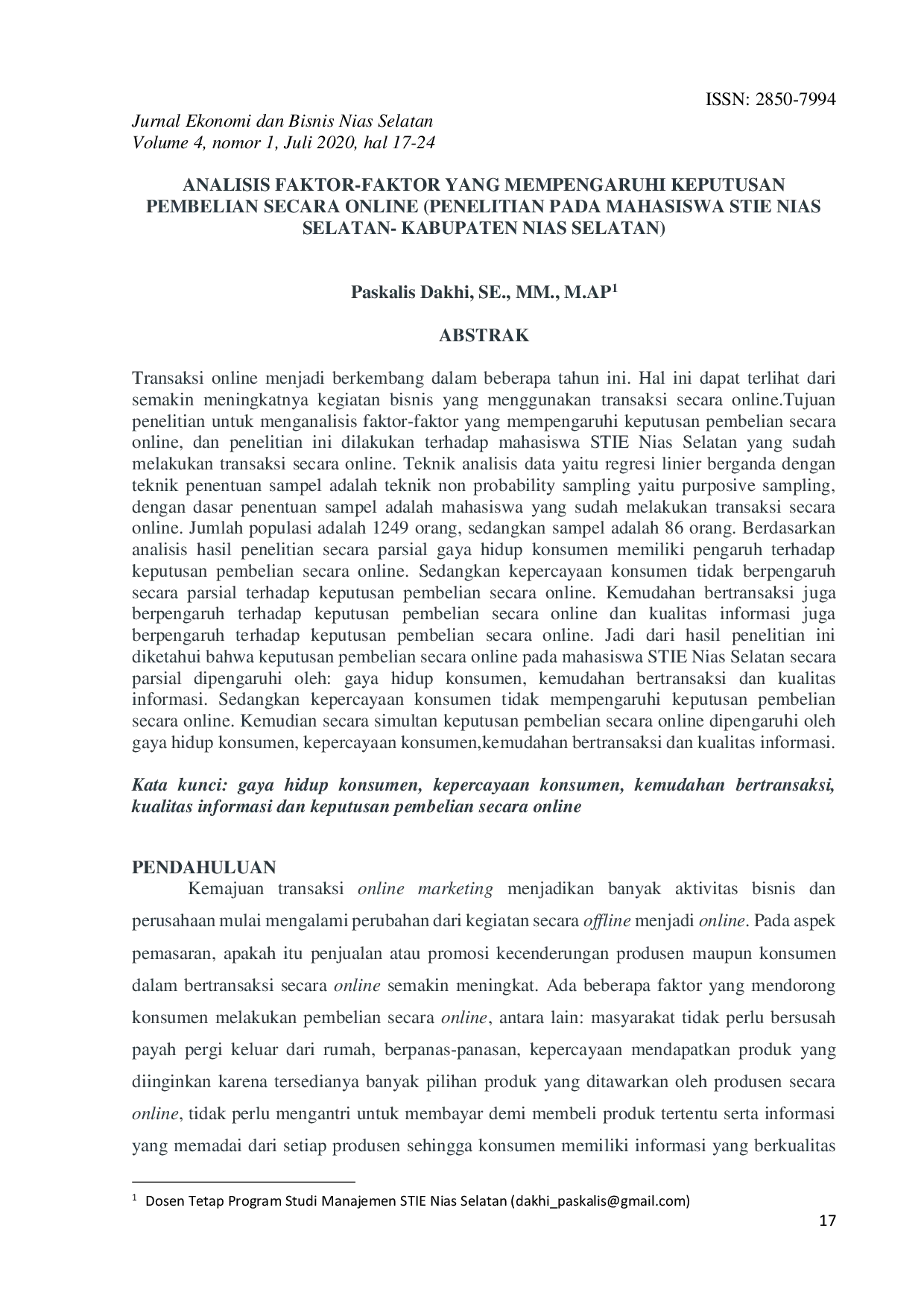 Jurnal Ekonomi dan Bisnis Nias SelatanJurnal Ekonomi dan Bisnis Nias SelatanTransaksi online telah berkembang pesat dalam beberapa tahun terakhir, terlihat dari peningkatan aktivitas bisnis yang menggunakan transaksi online. Penelitian ini bertujuan untuk menganalisis faktor-faktor yang mempengaruhi keputusan pembelian secara online pada mahasiswa STIE Nias Selatan yang telah melakukan transaksi online. Metode analisis data yang digunakan adalah regresi linier berganda dengan teknik penentuan sampel purposive sampling. Jumlah populasi adalah 1249 orang, sedangkan sampel adalah 86 orang. Hasil analisis menunjukkan bahwa gaya hidup konsumen, kemudahan bertransaksi, dan kualitas informasi secara parsial berpengaruh terhadap keputusan pembelian secara online, sementara kepercayaan konsumen tidak berpengaruh. Secara simultan, keputusan pembelian secara online dipengaruhi oleh gaya hidup konsumen, kepercayaan konsumen, kemudahan bertransaksi, dan kualitas informasi.