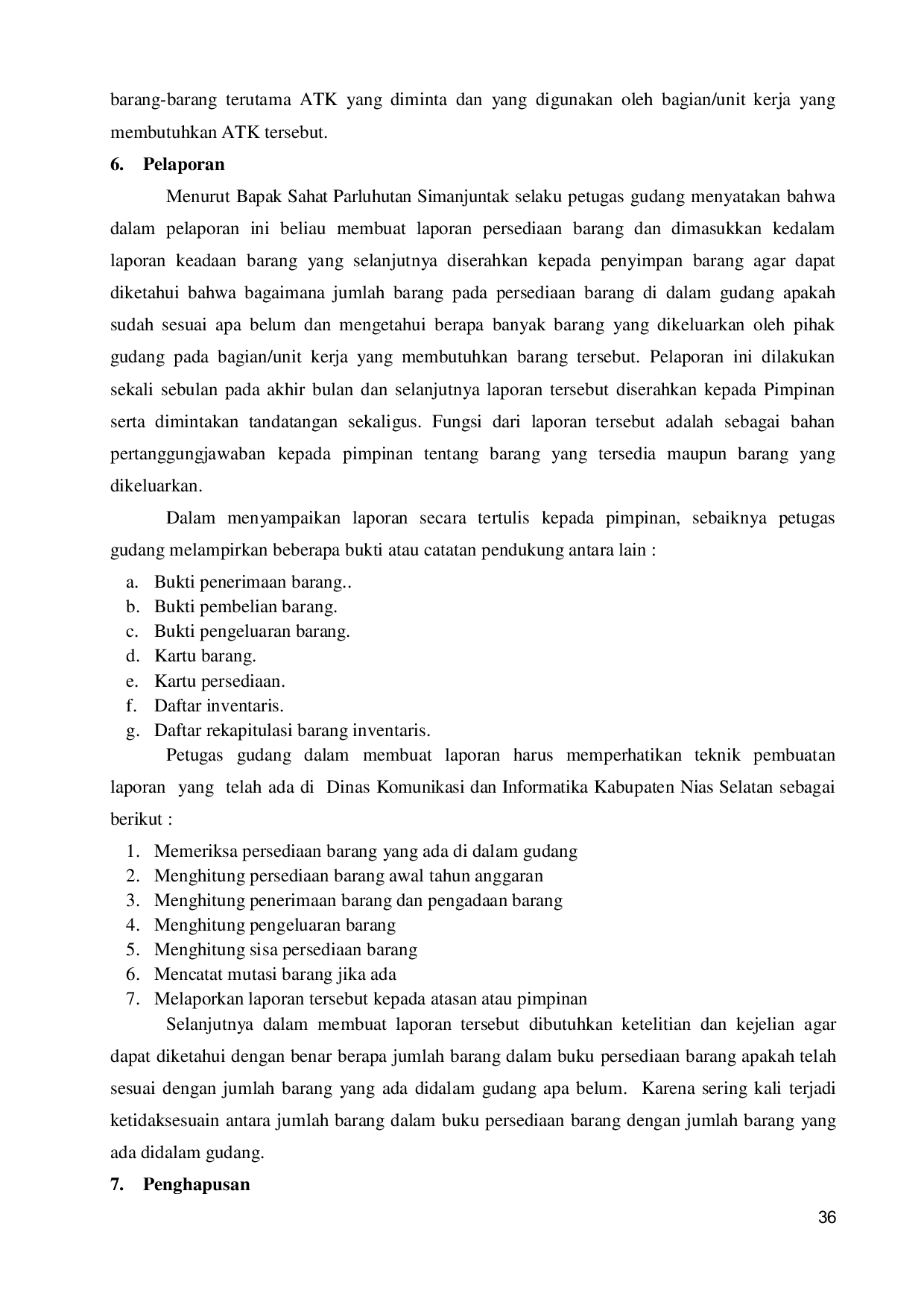 Pengelolaan barang habis pakai (ATK) di Dinas Komunikasi dan Informatika Kabupaten Nias Selatan telah dilaksanakan sesuai dengan siklus pengelolaan barang milik daerah, mencakup perencanaan, pengadaan, penerimaan, penyimpanan, penyaluran, pelaporan, dan penghapusan, serta mematuhi peraturan yang berlaku.Meskipun sebagian besar tahapan berjalan baik, terdapat kelemahan pada pencatatan dan pelaporan yang menyebabkan ketidaksesuaian antara data inventaris dan kondisi fisik barang di gudang.Oleh karena itu, peningkatan ketelitian pencatatan serta penerapan kontrol internal yang lebih ketat diperlukan untuk memastikan akurasi data dan efisiensi pengelolaan ATK.