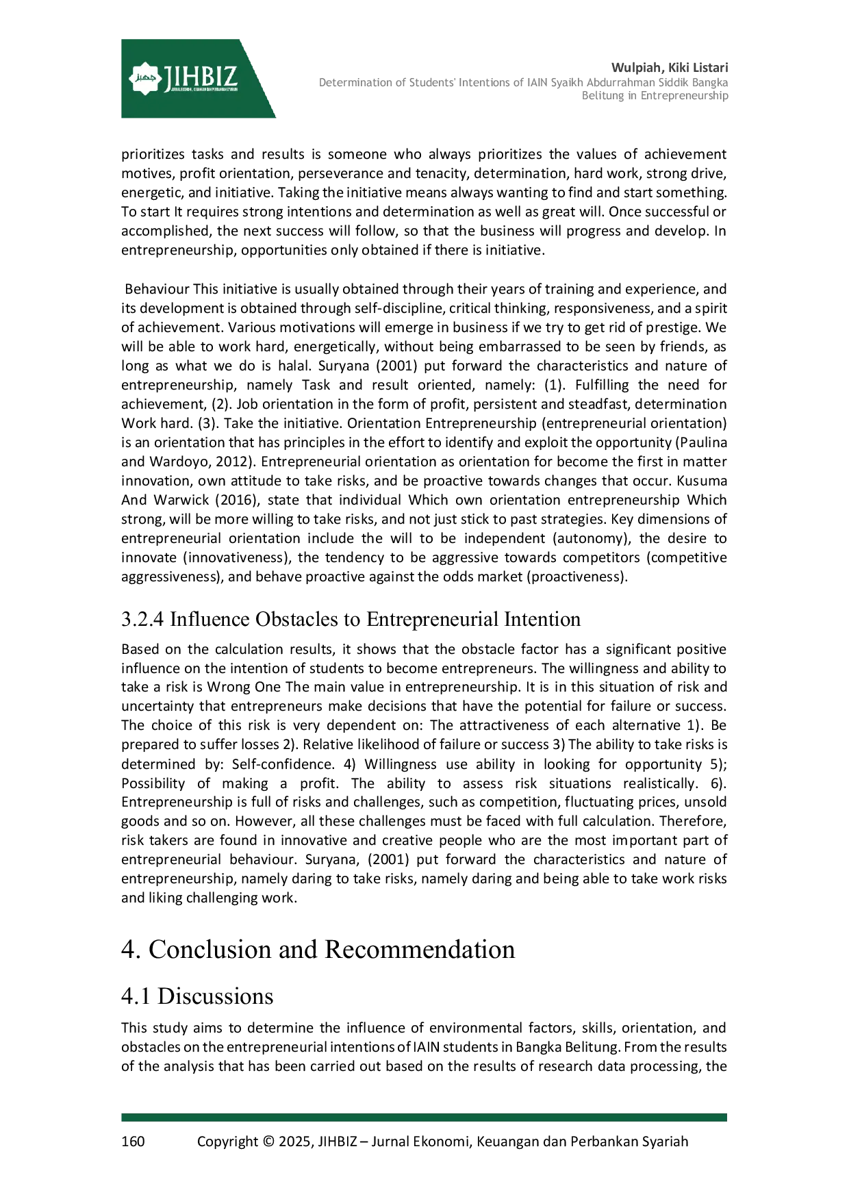 Penelitian selanjutnya dapat mengeksplorasi bagaimana peran variabel demografis seperti jenis kelamin, latar belakang pendidikan orang tua, dan program studi memoderasi pengaruh faktor lingkungan, keterampilan, orientasi, dan hambatan terhadap niat berwirausaha mahasiswa, dengan menguji perbedaan signifikan antar kelompok. Selain itu, studi longitudinal dapat ditambahkan untuk menilai perubahan niat berwirausaha seiring waktu dan mengidentifikasi faktor-faktor yang berkontribusi pada konversi niat menjadi tindakan nyata, misalnya melalui pelacakan alumni yang berhasil mendirikan usaha. Selanjutnya, penelitian dapat memperluas model dengan memasukkan variabel dukungan keluarga dan akses modal sebagai faktor eksternal, serta menguji interaksi antar variabel tersebut menggunakan pendekatan struktural equation modeling untuk memperoleh pemahaman yang lebih komprehensif tentang determinan niat kewirausahaan di kalangan mahasiswa.