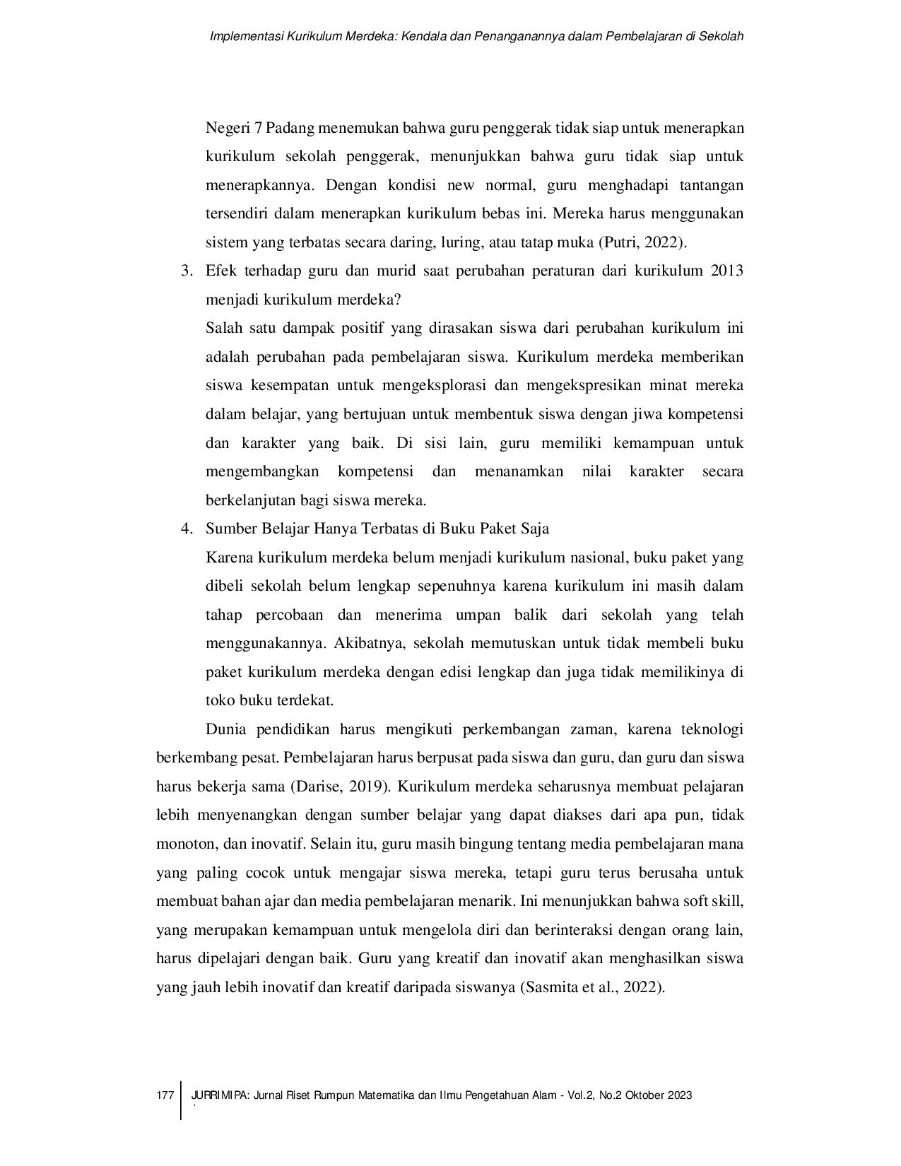 JURNAL RISET RUMPUN MATEMATIKA DAN ILMU PENGETAHUAN ALAMJURNAL RISET RUMPUN MATEMATIKA DAN ILMU PENGETAHUAN ALAMKuriku lum merdeka adalah kurikulum yang memiliki berbagai topik pembelajaran dan lebih fleksibel untuk guru dan siswa. Pada kenyataannya, pemerintah memberikan kewenangan dan tanggung jawab penuh kepada semua sekolah untuk membuat kurikulum yang sesuai dengan kebutuhan dan budaya mereka. Tujuan dari penelitian ini adalah untuk menemukan dan menjelaskan hambatan yang dihadapi guru dalam menerapkan kurikulum merdeka. Dengan demikian, sekolah penelitian dapat menentukan metode yang tepat untuk mengatasi hambatan ini. Penelitian ini menggunakan metode kualitatif deskriptif. Data yang dikumpulkan didasarkan pada wawancara dan tinjauan literatur dari jurnal-jurnal yang membahas kurikulum merdeka. Hasil penelitian menunjukkan bahwa guru menghadapi sejumlah tantangan dalam menerapkan kurikulum merdeka. Beberapa dari tantangan tersebut termasuk pemerintah yang tidak mensosialisasikan kurikulum merdeka, persiapan guru untuk beralih ke kurikulum merdeka, dan ketersediaan sumber pendidikan yang tersedia bagi guru, yang masih berfokus pada buku pelajaran dan buku pedoman.