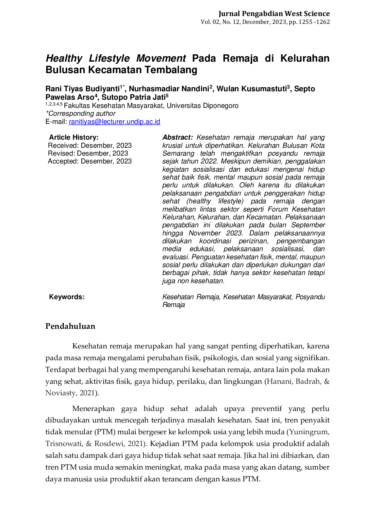 Jurnal Pengabdian West ScienceJurnal Pengabdian West ScienceKesehatan remaja merupakan hal yang sangat penting diperhatikan, karena pada masa remaja mengalami perubahan fisik, psikologis, dan sosial yang signifikan. Kelurahan Bulusan Kota Semarang telah mengaktifkan posyandu remaja sejak tahun 2022. Meskipun demikian, penggalakan kegiatan sosialisasi dan edukasi mengenai hidup sehat baik fisik, mental maupun sosial pada remaja perlu untuk dilakukan. Oleh karena itu dilakukan pelaksanaan pengabdian untuk penggerakan hidup sehat remaja dengan melibatkan lintas sektor seperti Forum Kesehatan Kelurahan, Kelurahan, dan Kecamatan. Pelaksanaan pengabdian ini dilakukan pada bulan September hingga November 2023. Dalam pelaksanaannya dilakukan koordinasi perizinan, pengembangan media edukasi, pelaksanaan sosialisasi, dan evaluasi. Penguatan kesehatan fisik, mental, maupun sosial perlu dilakukan dan diperlukan dukungan dari berbagai pihak, tidak hanya sektor kesehatan tetapi juga non kesehatan.