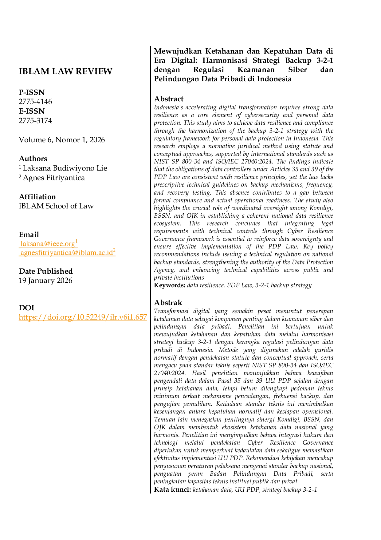 IBLAM LAW REVIEWIBLAM LAW REVIEWTransformasi digital yang semakin pesat menuntut penerapan ketahanan data sebagai komponen penting dalam keamanan siber dan pelindungan data pribadi. Penelitian ini bertujuan untuk mewujudkan ketahanan dan kepatuhan data melalui harmonisasi strategi backup 3-2-1 dengan kerangka regulasi pelindungan data pribadi di Indonesia. Metode yang digunakan adalah yuridis normatif dengan pendekatan statute dan conceptual approach, serta mengacu pada standar teknis seperti NIST SP 800-34 dan ISO/IEC 27040:2024. Hasil penelitian menunjukkan bahwa kewajiban pengendali data dalam Pasal 35 dan 39 UU PDP sejalan dengan prinsip ketahanan data, tetapi belum dilengkapi pedoman teknis minimum terkait mekanisme pencadangan, frekuensi backup, dan pengujian pemulihan. Ketiadaan standar teknis ini menimbulkan kesenjangan antara kepatuhan normatif dan kesiapan operasional. Temuan lain menegaskan pentingnya sinergi Komdigi, BSSN, dan OJK dalam membentuk ekosistem ketahanan data nasional yang harmonis. Penelitian ini menyimpulkan bahwa integrasi hukum dan teknologi melalui pendekatan Cyber Resilience Governance diperlukan untuk memperkuat kedaulatan data sekaligus memastikan efektivitas implementasi UU PDP. Rekomendasi kebijakan mencakup penyusunan peraturan pelaksana mengenai standar backup nasional, penguatan peran Badan Pelindungan Data Pribadi, serta peningkatan kapasitas teknis institusi publik dan privat.
