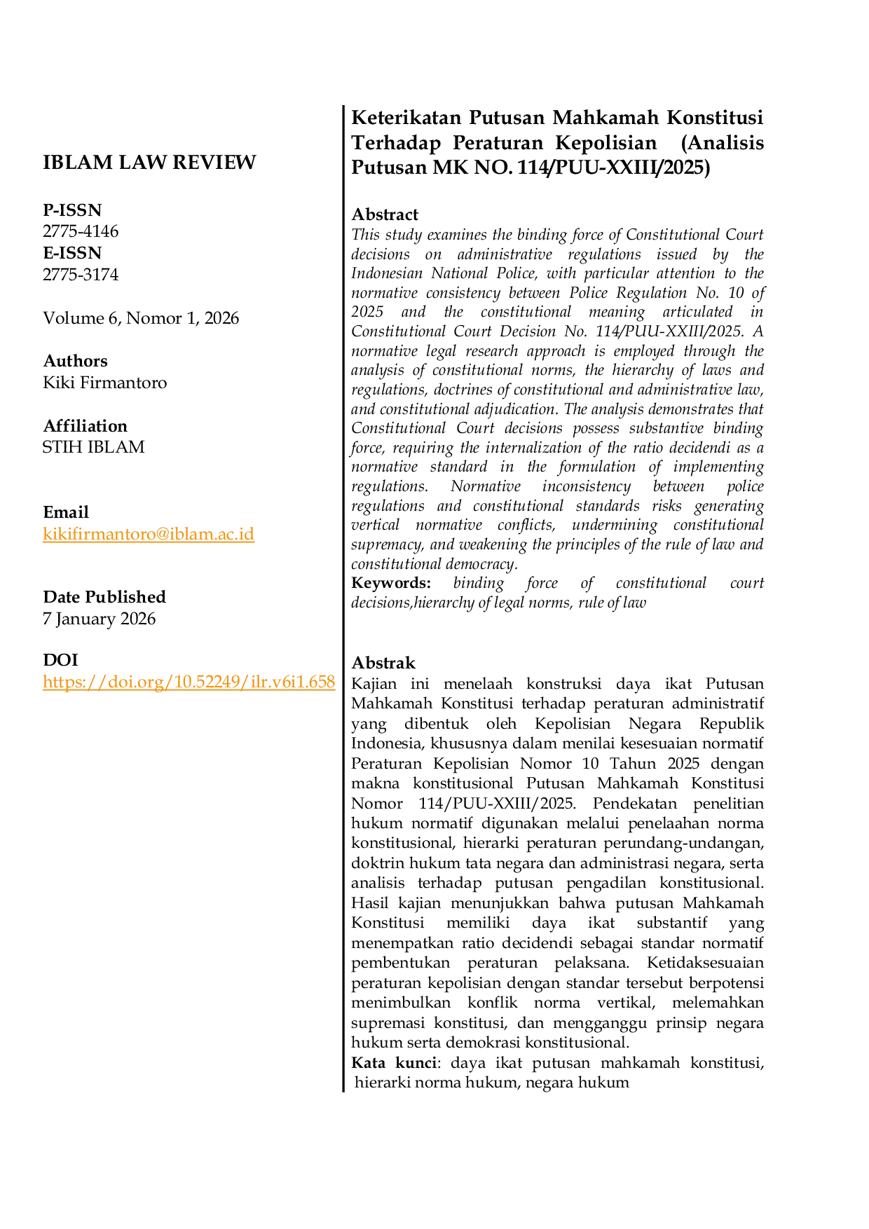 IBLAM LAW REVIEWIBLAM LAW REVIEWKajian ini menelaah konstruksi daya ikat Putusan Mahkamah Konstitusi terhadap peraturan administratif yang dibentuk oleh Kepolisian Negara Republik Indonesia, khususnya dalam menilai kesesuaian normatif Peraturan Kepolisian Nomor 10 Tahun 2025 dengan makna konstitusional Putusan Mahkamah Konstitusi Nomor 114/PUU-XXIII/2025. Pendekatan penelitian hukum normatif digunakan melalui penelaahan norma konstitusional, hierarki peraturan perundang-undangan, doktrin hukum tata negara dan administrasi negara, serta analisis terhadap putusan pengadilan konstitusional. Hasil kajian menunjukkan bahwa putusan Mahkamah Konstitusi memiliki daya ikat substantif yang menempatkan ratio decidendi sebagai standar normatif pembentukan peraturan pelaksana. Ketidaksesuaian peraturan kepolisian dengan standar tersebut berpotensi menimbulkan konflik norma vertikal, melemahkan supremasi konstitusi, dan mengganggu prinsip negara hukum serta demokrasi konstitusional.