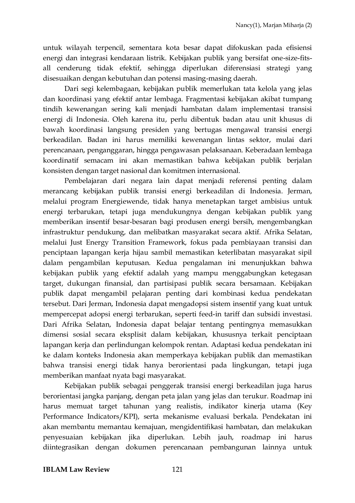 IBLAM LAW REVIEWIBLAM LAW REVIEWPerubahan iklim telah menjadi tantangan global yang memengaruhi seluruh aspek kehidupan, di mana penggunaan energi fosil secara masif menjadi penyumbang utama emisi gas rumah kaca. Indonesia, sebagai negara berkembang dengan ketergantungan tinggi pada batu bara, menghadapi tantangan besar untuk melakukan transisi energi menuju energi terbarukan secara berkeadilan, yang tidak hanya berorientasi pada pengurangan emisi juga menjamin perlindungan sosial, keadilan ekonomi, dan inklusivitas. Penelitian ini bertujuan untuk merumuskan strategi hukum dan kebijakan publik yang efektif dalam mewujudkan transisi energi berkeadilan di era perubahan iklim, dengan menekankan integrasi antara perlindungan lingkungan, keadilan sosial, dan pembangunan ekonomi rendah karbon. Metode penelitian yang digunakan adalah yuridis normatif dengan pendekatan kualitatif, mengkaji peraturan perundang‑undangan nasional, komitmen internasional, dokumen kebijakan publik, dan praktik terbaik di negara lain seperti Jerman dan Afrika Selatan. Hasil penelitian menunjukkan bahwa keberhasilan transisi energi berkeadilan memerlukan reformasi regulasi untuk mengakomodasi prinsip just transition, harmonisasi hukum nasional dengan komitmen global, penguatan mekanisme penegakan hukum, pembentukan instrumen pembiayaan khusus, serta kebijakan publik yang memberikan insentif dan melibatkan masyarakat secara aktif. Dengan sinergi antara kerangka hukum yang adaptif dan kebijakan publik yang progresif, Indonesia memiliki peluang besar untuk mencapai transisi energi yang berkelanjutan dan inklusif.
