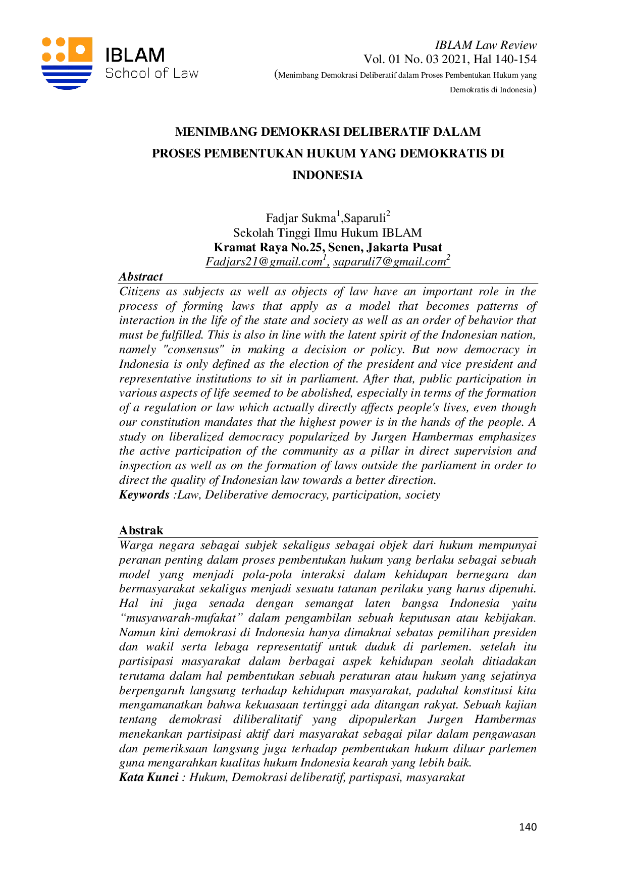 IBLAM LAW REVIEWIBLAM LAW REVIEWWarga negara sebagai subjek sekaligus sebagai objek dari hukum mempunyai peranan penting dalam proses pembentukan hukum yang berlaku sebagai sebuah model yang menjadi pola-pola interaksi dalam kehidupan bernegara dan bermasyarakat sekaligus menjadi sesuatu tatanan perilaku yang harus dipenuhi. Hal ini juga senada dengan semangat musyawarah-mufakat dalam pengambilan sebuah keputusan atau kebijakan. Namun kini demokrasi di Indonesia hanya dimaknai sebatas pemilihan presiden dan wakil serta lebaga representatif untuk duduk di parlemen. Setelah itu partisipasi masyarakat dalam berbagai aspek kehidupan seolah ditiadakan terutama dalam hal pembentukan sebuah peraturan atau hukum yang sejatinya berpengaruh langsung terhadap kehidupan masyarakat, padahal konstitusi kita mengamanatkan bahwa kekuasaan tertinggi ada ditangan rakyat. Sebuah kajian tentang demokrasi diliberalitatif yang dipopulerkan Jurgen Hambermas menekankan partisipasi aktif dari masyarakat sebagai pilar dalam pengawasan dan pemeriksaan langsung juga terhadap pembentukan hukum diluar parlemen guna mengarahkan kualitas hukum Indonesia kearah yang lebih baik.
