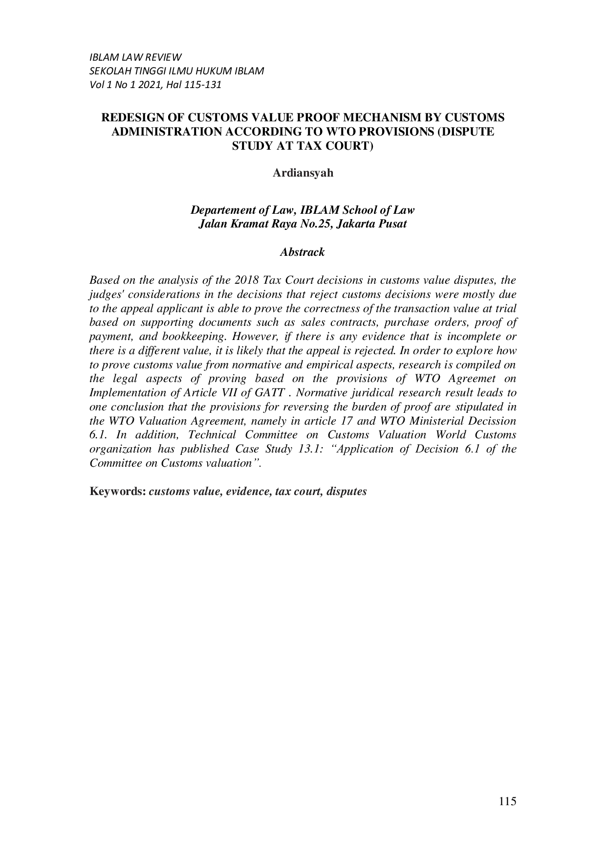 IBLAM LAW REVIEWIBLAM LAW REVIEWBerdasarkan analisa terhadap putusan-putusan Pengadilan Pajak tahun 2018 dalam sengketa nilai pabean, pertimbangan hakim dalam putusan-putusan yang mengalahkan DJBC sebagian besar disebabkan pemohon banding dapat membuktikan kebenaran nilai transaksi di persidangan berdasarkan dokumen-dokumen pendukung nilai transaksi seperti Sales Contract, Purchase Order, bukti pembayaran, dan pembukuan. Namun apabila terdapat bukti-bukti yang tidak lengkap atau terdapat nilai yang berbeda kemungkinan besar permohonan banding ditolak. Dalam rangka menggali bagaimana pembuktian nilai pabean dari aspek normatif dan empiris maka disusun penelitian atas aspek hukum pembuktian nilai pabean berdasarkan ketentuan WTO Agreement on Implementation of Article VII of GATT. Analisis normatif dalam penelitian ini membatasi aspek hukum pembuktian sebagai dasar penetapan nilai pabean oleh pejabat Bea dan Cukai dan Pengadilan Pajak. Penelitian yuridis normatif terkait hukum pembuktian menghasilkan kesimpulan bahwa ketentuan pembalikan beban pembuktian tercantum dalam WTO Valuation Agreement yaitu pada pasal 17 dan WTO Ministerial Decision 6.1 yang telah diratifikasi dengan UU No.7 tahun 1994 tentang Pengesahan WTO. Selain itu, Komite Teknis Penilaian Bea Cukai Organisasi Bea Cukai Dunia telah menerbitkan Studi Kasus 13.1: Penerapan Keputusan 6.1 dari Komite Penilaian Bea Cukai.