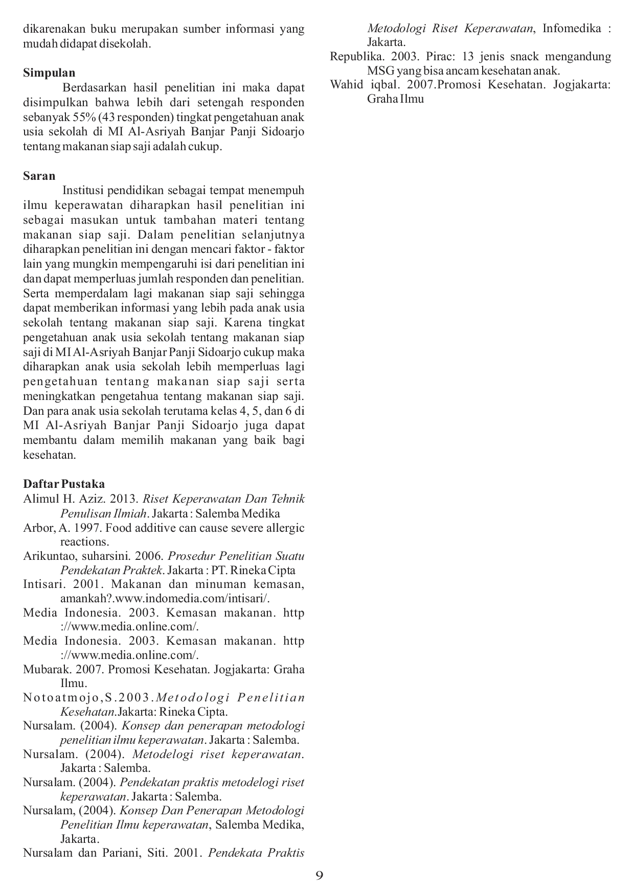 Penelitian lanjutan dapat dilakukan dengan menginvestigasi lebih dalam faktor-faktor yang memengaruhi pilihan makanan anak usia sekolah, seperti pengaruh iklan, lingkungan keluarga, dan tekanan teman sebaya. Selain itu, penting untuk meneliti efektivitas berbagai metode penyuluhan kesehatan dalam meningkatkan pengetahuan dan perilaku anak terkait konsumsi makanan siap saji, misalnya melalui pendekatan interaktif seperti permainan edukatif atau demonstrasi memasak makanan sehat. Terakhir, penelitian dapat difokuskan pada dampak jangka panjang konsumsi makanan siap saji terhadap prestasi akademik dan kesehatan mental anak usia sekolah, dengan mempertimbangkan variabel-variabel lain seperti status sosial ekonomi dan pola makan keluarga. Penelitian-penelitian ini diharapkan dapat memberikan informasi yang lebih komprehensif untuk merumuskan strategi intervensi yang efektif dalam meningkatkan kesehatan dan kesejahteraan anak-anak.