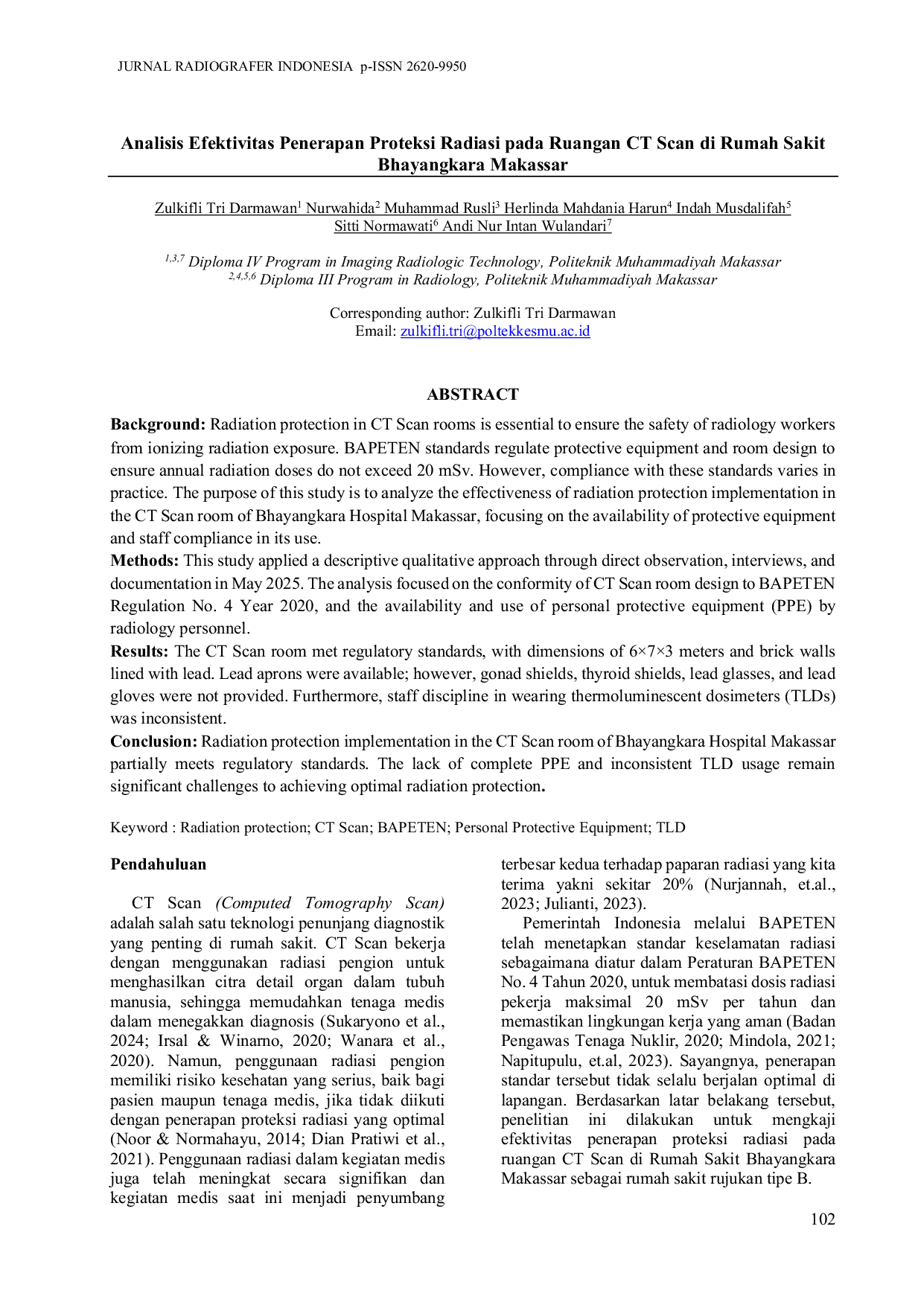 JRI (Jurnal Radiografer Indonesia)JRI (Jurnal Radiografer Indonesia)Radiasi perlindungan di ruang CT Scan sangat penting untuk menjamin keselamatan pekerja radiologi dari paparan radiasi pengion. Standar BAPETEN mengatur peralatan pelindung dan desain ruangan untuk memastikan dosis radiasi tahunan tidak melebihi 20 mSv. Namun, kepatuhan terhadap standar ini bervariasi dalam praktik. Tujuan penelitian ini adalah menganalisis efektivitas penerapan proteksi radiasi di ruang CT Scan Rumah Sakit Bhayangkara Makassar, dengan fokus pada ketersediaan peralatan pelindung dan kepatuhan staf dalam penggunaannya.