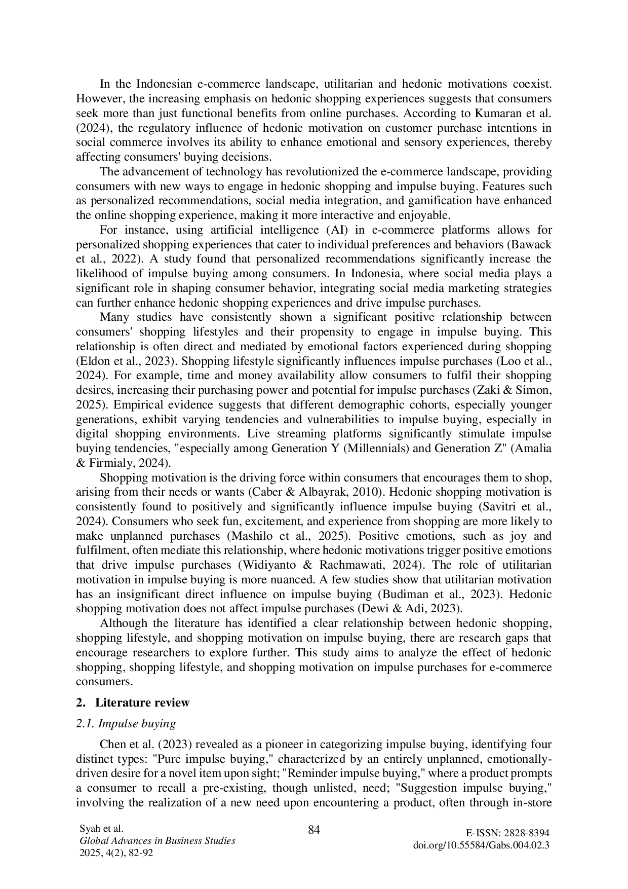 Global Advances in Business StudiesGlobal Advances in Business StudiesThis study examines the influence of hedonic shopping, shopping lifestyle, and shopping motivation on impulse purchases among e-commerce consumers in Indonesia. With the rapid growth of Indonesias e-commerce market, it is important to understand the psychological factors that drive consumer behavior. This study uses a descriptive quantitative approach by distributing questionnaires to 112 respondents who are e-commerce users. Independent variables are hedonic shopping and shopping lifestyle, the dependent variable is impulse buying, and the moderating variable is shopping motivation. The results show that hedonic shopping and shopping motivation significantly and positively affect impulse purchases, while shopping lifestyle does not. Furthermore, shopping motivation cannot moderate the relationship between hedonic shopping and shopping lifestyle on impulse purchases. These findings underscore the importance of emotional experience and internal motivation in driving impulse purchases in e-commerce environments.