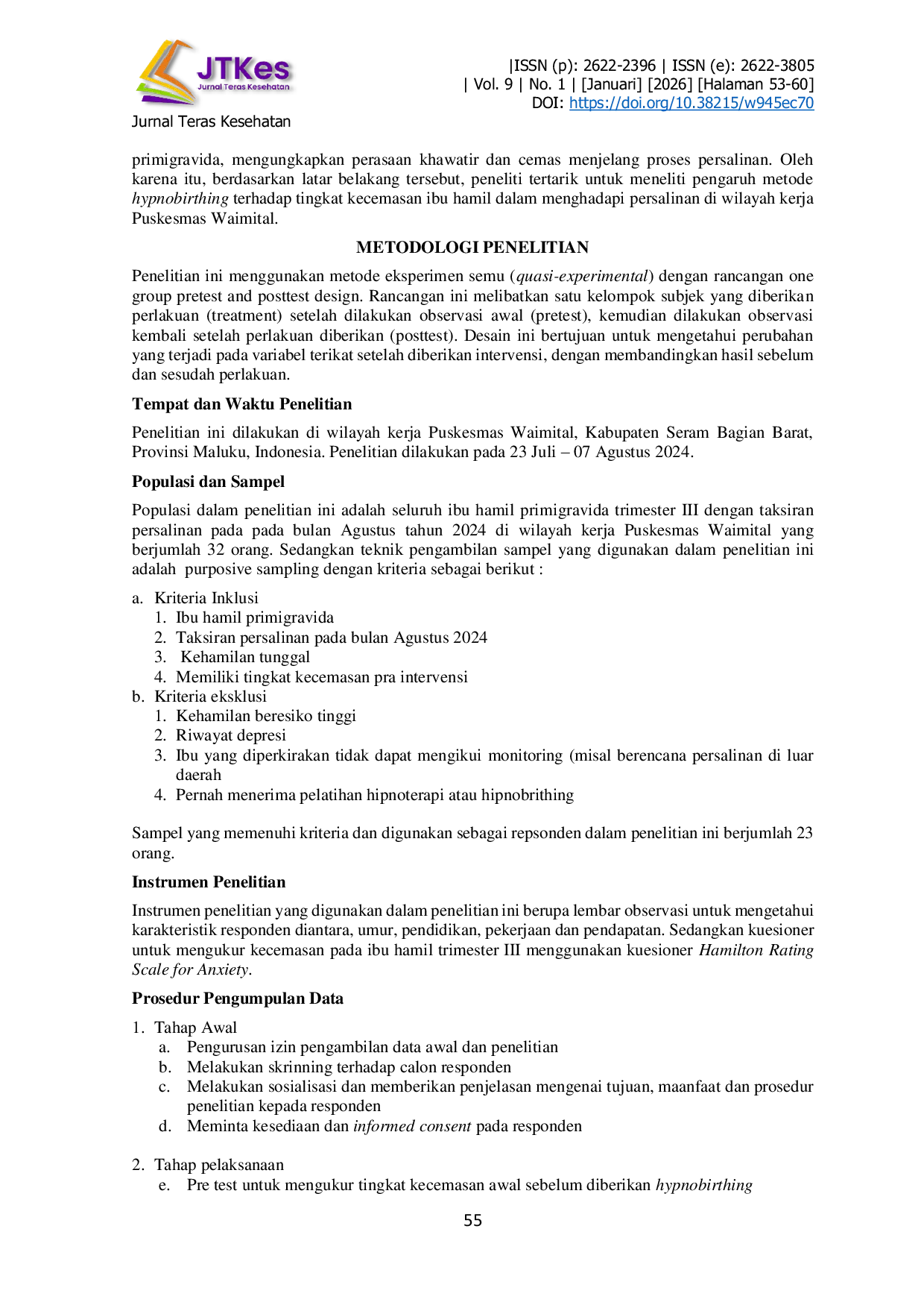 Jurnal Teras KesehatanJurnal Teras KesehatanLatar Belakang: Kehamilan merupakan proses fisiologis yang alami dalam kehidupan wanita, dimulai dengan pembuahan ovum oleh sel sperma dan berlangsung selama kurang lebih 37 hingga 40 minggu. Memasuki tahap akhir kehamilan atau trimester ketiga (antara minggu ke-28 hingga ke-37), sebagian besar ibu hamil cenderung mengalami kecemasan. Kondisi kecemasan yang tidak dikelola dengan baik dapat menimbulkan dampak negatif, baik secara fisik maupun psikologis, terhadap ibu dan janin. Salah satu intervensi untuk menurunkan tingkat kecemasan pada ibu hamil adalah metode hypnobirthing. Tujuan: Penelitian ini bertujuan untuk menganalisis pengaruh metode hypnobirthing terhadap tingkat kecemasan pada ibu hamil trimester III di wilayah kerja Puskesmas Waimital. Metode: Jenis penelitian ini adalah kuasi-eksperimen dengan rancangan pre-test dan post-test. Sampel penelitian terdiri atas 23 ibu hamil primigravida trimester III yang diambil dengan teknik total sampling. Hasil: Hasil analisis bivariat menunjukkan adanya penurunan tingkat kecemasan setelah dilakukan intervensi hypnobirthing, dengan nilai p = 0,000 < α = 0,05. Kesimpulan: Metode hypnobirthing berpengaruh secara signifikan terhadap penurunan tingkat kecemasan pada ibu hamil trimester III di wilayah kerja Puskesmas Waimital.