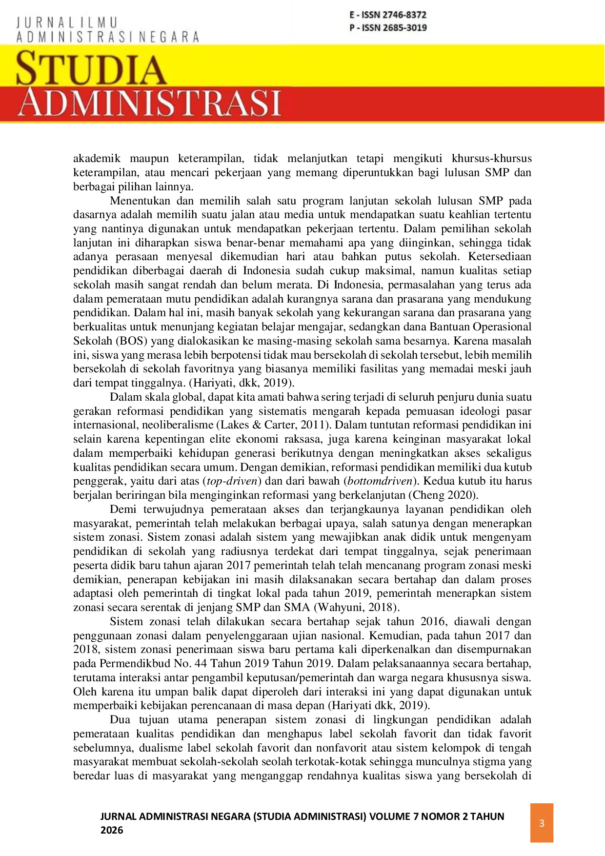 Jurnal Studia AdministrasiJurnal Studia AdministrasiKebijakan sistem zonasi belum sepenuhnya diimplementasikan sesuai dengan peraturan perundang-undangan yang relevan. Penelitian ini bertujuan untuk mengkaji bagaimana kebijakan sistem zonasi diimplementasikan dan bagaimana pengaruhnya terhadap Penerimaan Siswa Baru (PPDB) di tingkat SMP swasta di Kabupaten Sungailiat. Sekolah swasta sangat terpengaruh oleh sistem zonasi, yang pertama kali diterapkan untuk menyamakan akses dan kualitas pendidikan di sekolah negeri, terutama dalam hal jumlah pelamar yang lebih sedikit. Penelitian ini menggunakan metodologi kualitatif deskriptif dengan sumber data primer dan sekunder. Hasil penelitian menunjukkan bahwa implementasi kebijakan zonasi belum sepenuhnya mempertimbangkan pemerataan akses pendidikan, sehingga berdampak negatif bagi sekolah swasta, terutama pada masa awal pemberlakuan zonasi. Kebijakan sistem zonasi belum sepenuhnya memeratakan akses pendidikan. Terdapat pula ketimpangan persepsi di masyarakat yang lebih memprioritaskan sekolah negeri. Rekomendasi yang diberikan antara lain perlunya pedoman teknis zonasi yang lebih rinci, monitoring dan evaluasi berkala, peningkatan kualitas layanan pendidikan di sekolah swasta, serta penguatan kolaborasi dan sosialisasi kepada masyarakat untuk menciptakan distribusi peserta didik yang lebih merata.