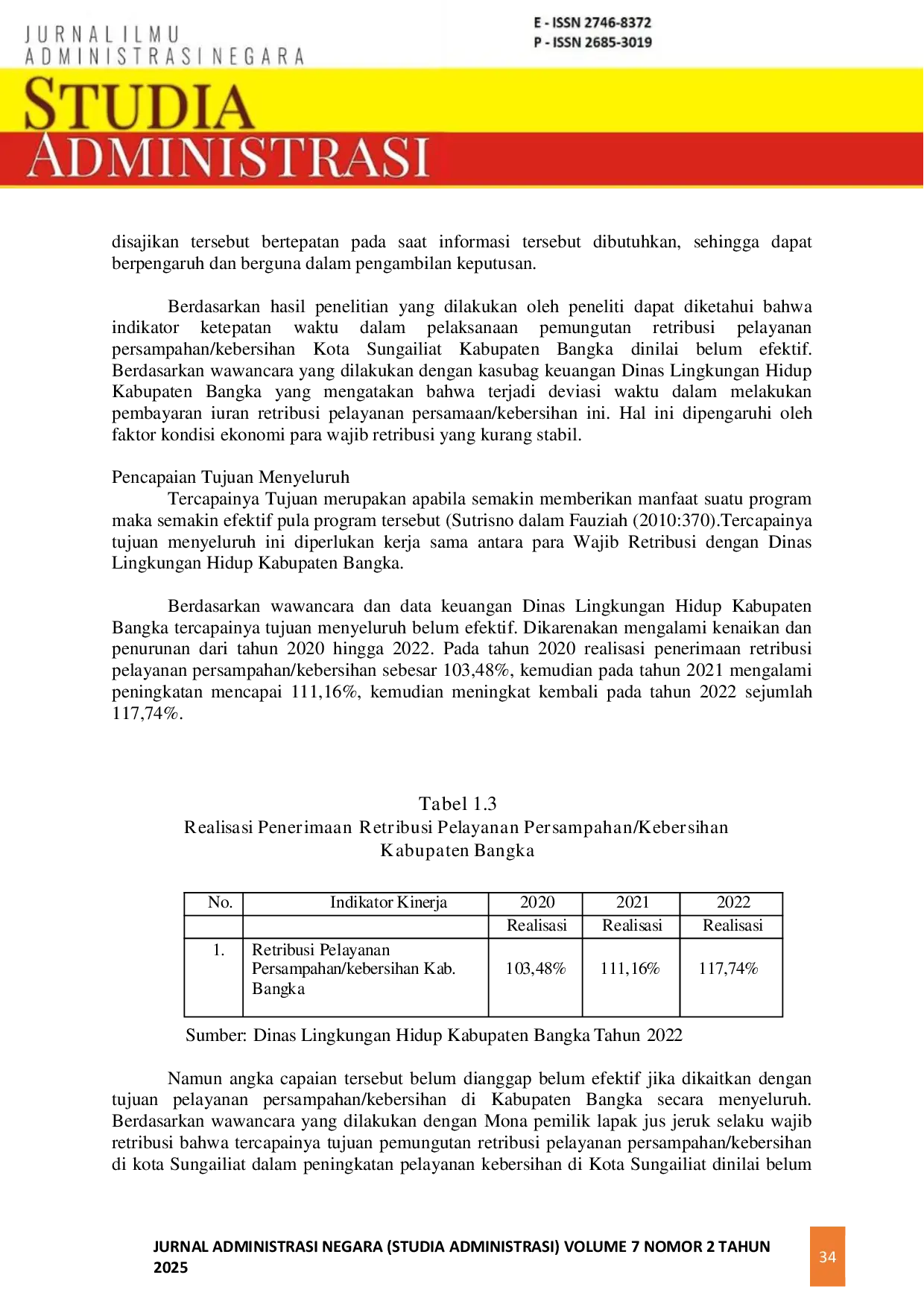 Jurnal Studia AdministrasiJurnal Studia AdministrasiPenelitian ini bertujuan untuk menganalisis efektivitas pemungutan retribusi pelayanan persampahan/kebersihan Kota Sungailiat dan menginvestigasi faktor-faktor penyebab belum efektifnya pemungutan retribusi pelayanan persampahan/kebersihan di Kota Sungailiat Kabupaten Bangka. Metode penelitian yang digunakan adalah metode kualitatif dengan teknik wawancara kepada responden di Dinas Lingkungan Hidup Kabupaten Bangka dan Wajib Retribusi (WR). Hasil penelitian menunjukkan bahwa penerimaan retribusi berada pada kriteria belum efektif. Hal lain yang ditemukan dalam penelitian ini ialah penyebab belum efektifnya penerimaan retribusi dikarenakan faktor ketepatan waktu dan faktor sumber daya.
