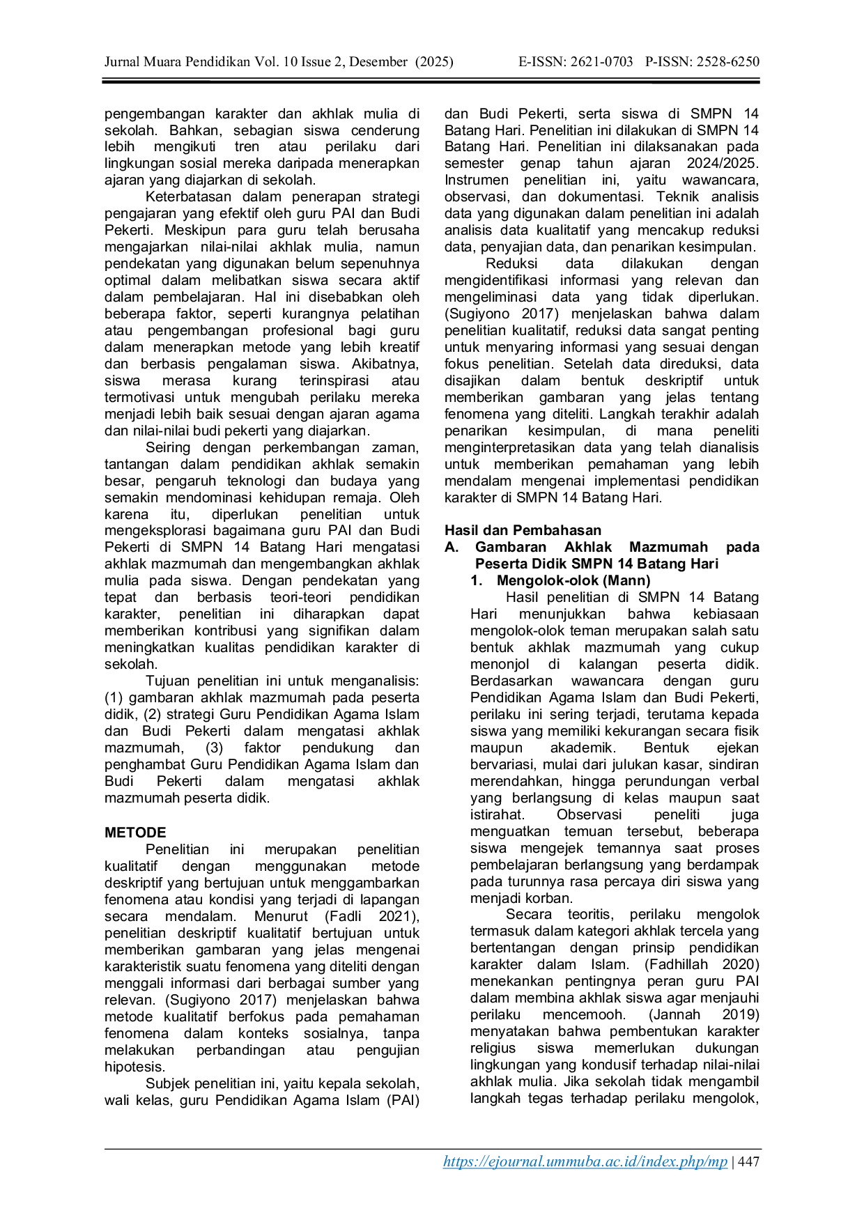 Jurnal Muara PendidikanJurnal Muara PendidikanPenelitian ini dilatarbelakangi oleh beberapa masalah yang menjadi perhatian terkait dengan pembinaan akhlak mulia pada siswa. Tujuan penelitian ini untuk menganalisis . Penelitian ini merupakan penelitian kualitatif dengan menggunakan metode deskriptif. Penelitian ini dilakukan di SMPN 14 Batang Hari. Subjek penelitian ini, yaitu kepala sekolah, wali kelas, guru Pendidikan Agama Islam (PAI) dan Budi Pekerti, serta siswa di SMPN 14 Batang Hari. Instrumen penelitian ini, yaitu wawancara, observasi, dan dokumentasi. Teknik analisis data penelitian ini adalah analisis data kualitatif yang mencakup reduksi data, penyajian data, dan penarikan kesimpulan. Hasil penelitian ini (1) Adapun gambaran akhlak mazmumah pada peserta didik di SMPN 14 Batang hari, yaitu mengolok-olok (Mann), dusta, ingkar janji (Khianat/ghadar), dan egoistik. (2) strategi Guru PAI dan Budi Pekerti dalam mengatasi akhlak mazmumah, yaitu keteladanan, pembiasaan, nasihat, dan hukuman. (3) faktor pendukung Guru PAI dan Budi Pekerti dalam mengatasi akhlak mazmumah, yaitu adanya dukungan pihak sekolah, kemampuan komunikasi yang baik, tersedianya materi ajar yang relevan untuk menanamkan nilai-nilai karakter. Selanjutnya, faktor penghambatnya, yaitu terbatasnya waktu pembelajaran, kurangnya dukungan dari orang tua, pengaruh lingkungan pertemanan di luar sekolah, dan belum optimalnya fasilitas dan sarana pendukung pembentukan karakter siswa.