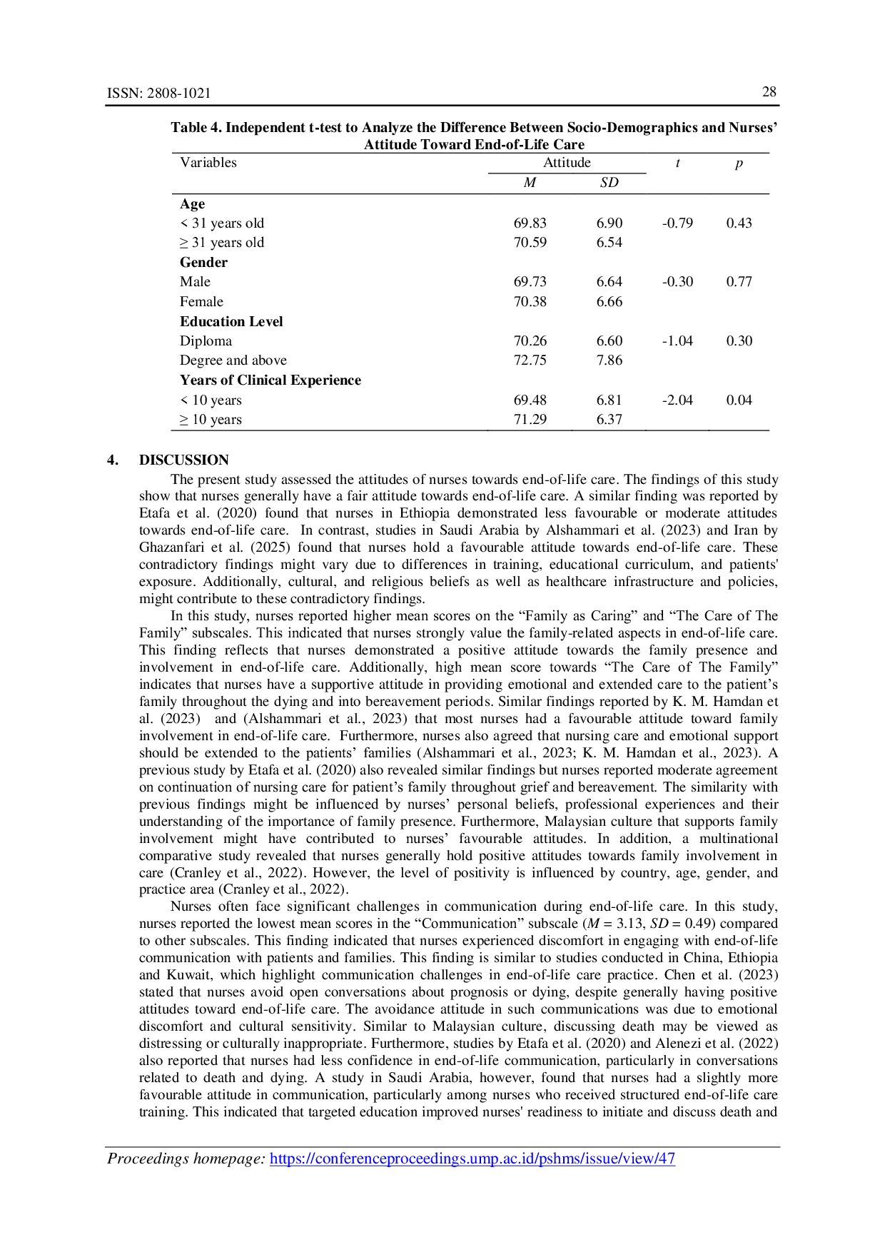 Perawat di rumah sakit umum Malaysia secara umum menunjukkan sikap yang berada pada tingkat sedang hingga positif terhadap perawatan akhir hayat, dengan pengalaman kerja lebih lama berkontribusi pada sikap yang lebih mendukung.Namun, sikap pada aspek komunikasi masih kurang optimal dan perawat mengalami ketidaknyamanan emosional sedang dalam memberikan perawatan kepada pasien akhir hayat dan keluarganya.Oleh karena itu, diperlukan intervensi berupa program dukungan dan pelatihan khusus yang menekankan keterampilan komunikasi serta coping emosional bagi perawat.