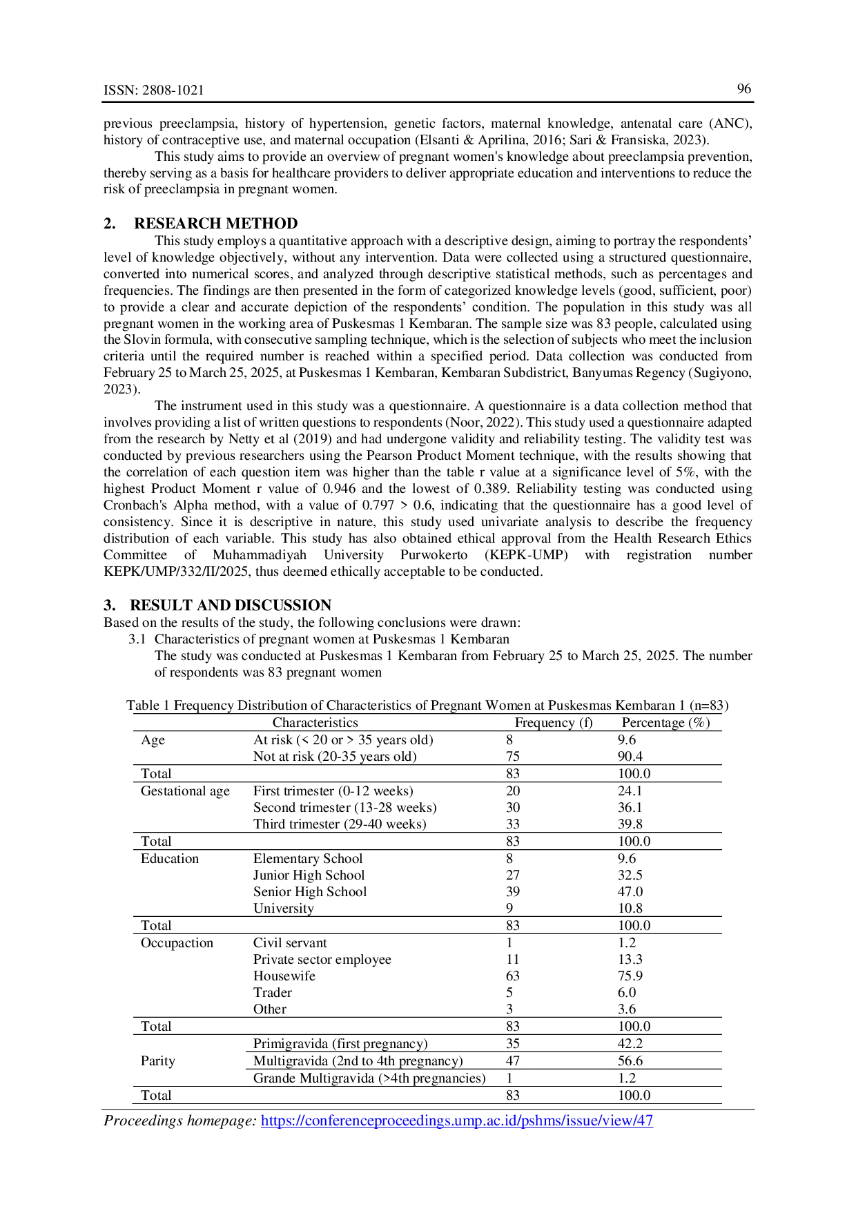 Berdasarkan hasil analisis data dan diskusi, dapat disimpulkan bahwa wanita hamil di Puskesmas 1 Kembaran sebagian besar berada dalam rentang usia non-risiko 20-35 tahun, kebanyakan berada di trimester ketiga kehamilan.Mayoritas memiliki tingkat pendidikan sekolah menengah, bekerja sebagai ibu rumah tangga, dan merupakan ibu multigravida, yang menunjukkan pengalaman sebelumnya dengan kehamilan dan layanan kesehatan ibu.Selain itu, tingkat pengetahuan secara keseluruhan responden mengenai pencegahan preeklampsia umumnya baik.Hal ini menunjukkan bahwa wanita hamil di lingkungan ini memiliki kesadaran dan pemahaman yang memadai tentang preeklampsia, termasuk risiko dan langkah-langkah pencegahannya, yang mungkin dipengaruhi oleh akses mereka terhadap informasi kesehatan dan keterlibatan dalam layanan perawatan antenatal.