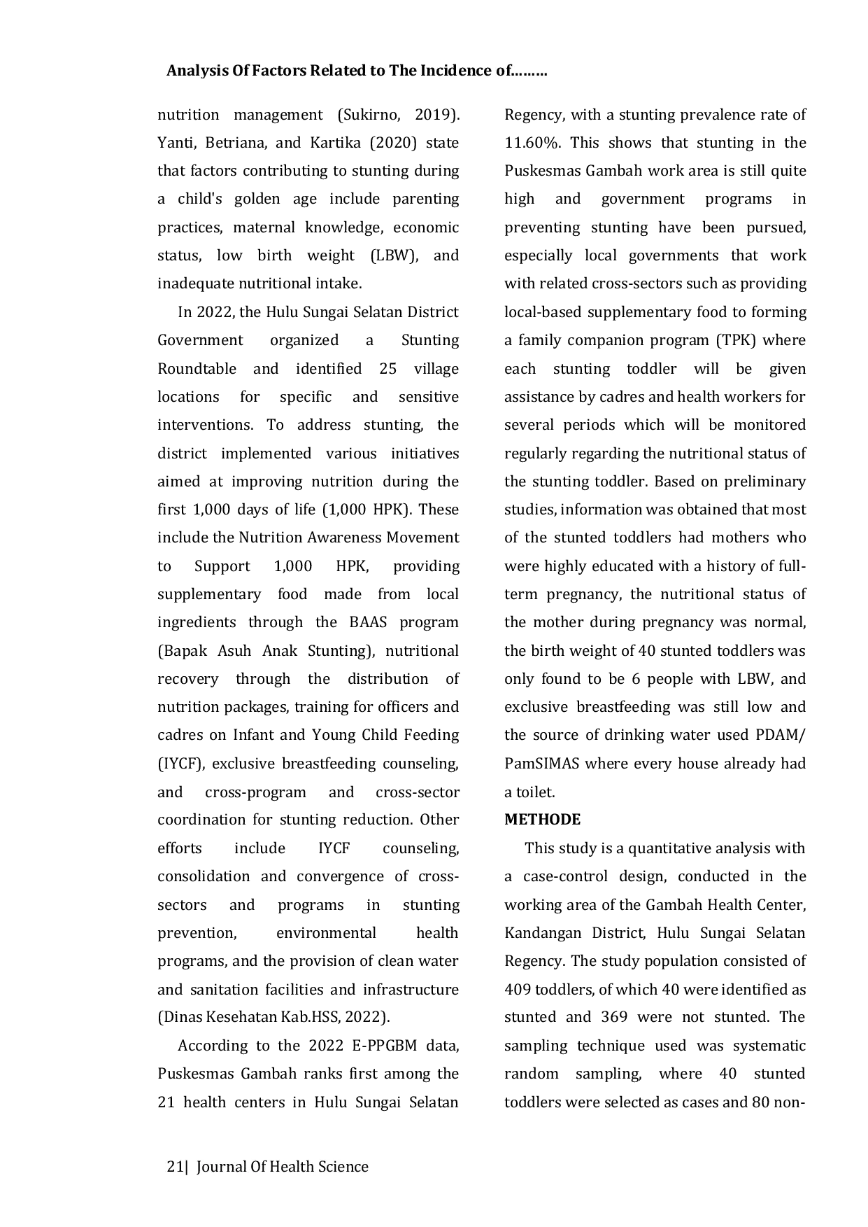Journal Of Health Science (Jurnal Ilmu Kesehatan)Journal Of Health Science (Jurnal Ilmu Kesehatan)Stunting merupakan kondisi kegagalan pertumbuhan pada balita. Hasil survei SSGI 2022 menunjukkan bahwa prevalensi stunting di Indonesia mencapai 21,6 %. Data Dinas Kesehatan Provinsi Kalimantan Selatan 2022 menunjukkan angka 24,6 %, sedangkan Data Dinas Kesehatan Hulu Sungai Selatan 2022 menunjukkan 4,53 %. Dari 21 Puskesmas di wilayah HSS, Puskesmas Gambah menempati peringkat pertama dengan tingkat stunting tertinggi sebesar 11,60 %. Stunting tidak disebabkan oleh satu faktor tunggal melainkan oleh faktor multifaktorial. Penelitian ini bertujuan menganalisis faktor‑faktor yang berhubungan dengan kejadian stunting pada balita di wilayah kerja Puskesmas Gambah tahun 2022. Penelitian kuantitatif dengan desain studi kasus‑kontrol, menggunakan uji chi‑square dan odds ratio. Sampel terdiri dari 120 balita (40 kasus dan 80 kontrol). Hasil menunjukkan bahwa faktor-faktor yang berhubungan dengan kejadian stunting meliputi berat badan lahir (p‑value 0,022, OR 3,381), menyusui eksklusif (p‑value 0,000, OR 5,741), tingkat pendidikan ibu (p‑value 0,015, OR 5,444), riwayat usia kehamilan (p‑value 0,000, OR 9,736), dan status gizi ibu (p‑value 0,006, OR 8,273).