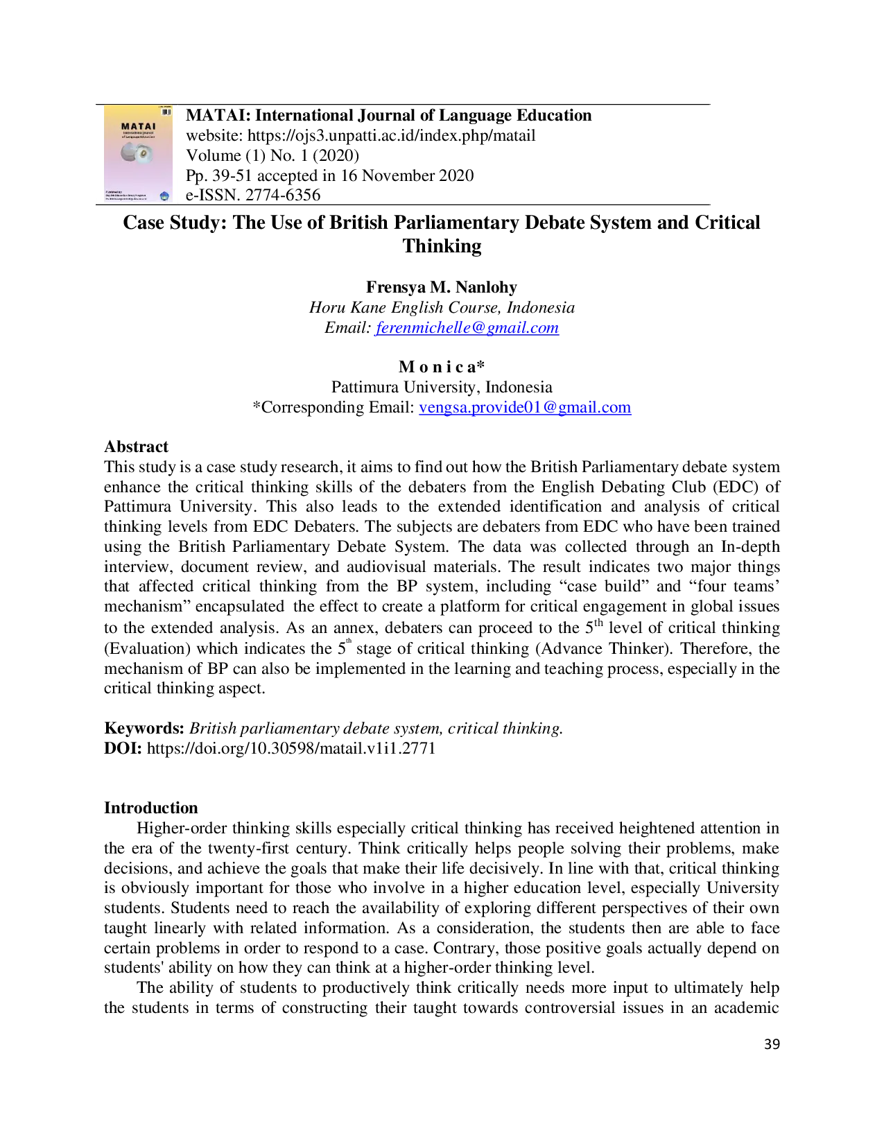 MATAI: International Journal of Language EducationMATAI: International Journal of Language EducationPenelitian studi kasus ini bertujuan untuk mengetahui bagaimana sistem debat parlementer Inggris meningkatkan keterampilan berpikir kritis peserta debat dari English Debating Club (EDC) Universitas Pattimura. Penelitian ini juga mengidentifikasi dan menganalisis tingkat berpikir kritis peserta debat EDC. Subjek penelitian adalah peserta debat dari EDC yang telah dilatih menggunakan Sistem Debat Parlementer Inggris. Data dikumpulkan melalui wawancara mendalam, tinjauan dokumen, dan materi audiovisual. Hasil penelitian menunjukkan dua hal utama yang memengaruhi berpikir kritis dari sistem BP, yaitu “pembangunan kasus dan “mekanisme empat tim yang merangkum efek untuk menciptakan platform keterlibatan kritis dalam isu-isu global. Sebagai tambahan, peserta debat dapat melanjutkan ke tingkat ke-5 berpikir kritis (Evaluasi) yang menunjukkan tahap ke-5 dari berpikir kritis (Pemikir Tingkat Lanjut). Oleh karena itu, mekanisme BP juga dapat diterapkan dalam proses pembelajaran dan pengajaran, terutama dalam aspek berpikir kritis.