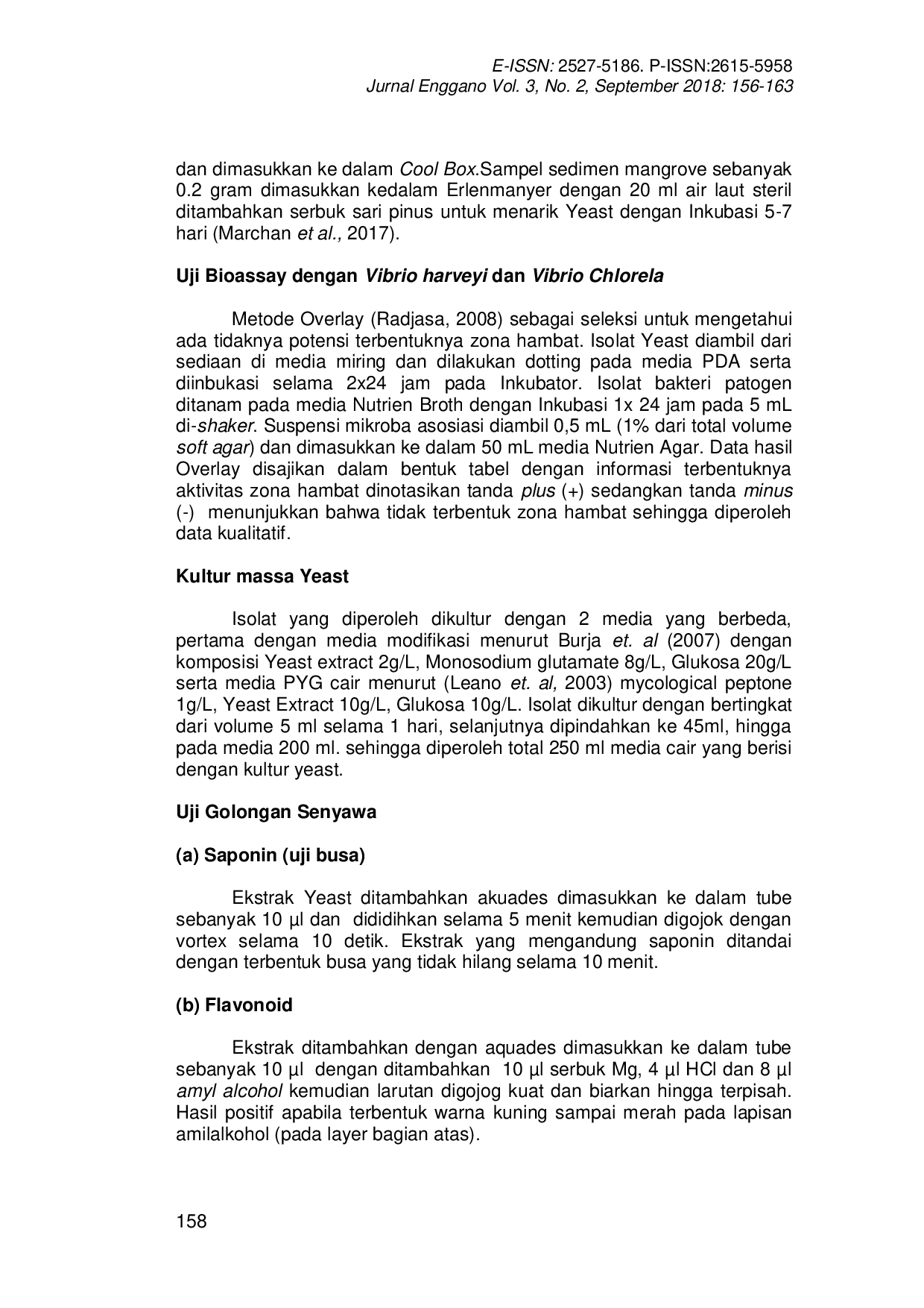 Jurnal EngganoJurnal EngganoYeast adalah mikroorganisme yang tidak dapat membentuk misellium. Tujuan dari penelitian ini untuk mengetahui aktivitas antibakteri dan mengidentifikasi golongan senyawa dari ekstrak yeast. Metode penelitian yang dilakukan antara lain: sampling dan isolasi, kultur massal, uji bioassay dengan bakteri Vibrio harveyi dan Vibrio cholerae, analisis fitokimia, dan identifikasi molekular yang menunjukkan bahwa isolat KM3 memiliki kemiripan 99% dengan Candida fermentati serta memiliki aktivitas antibakteri. Uji fitokimia mengidentifikasi golongan senyawa saponin, tanin, alkaloid, steroid, dan triterpenoid.