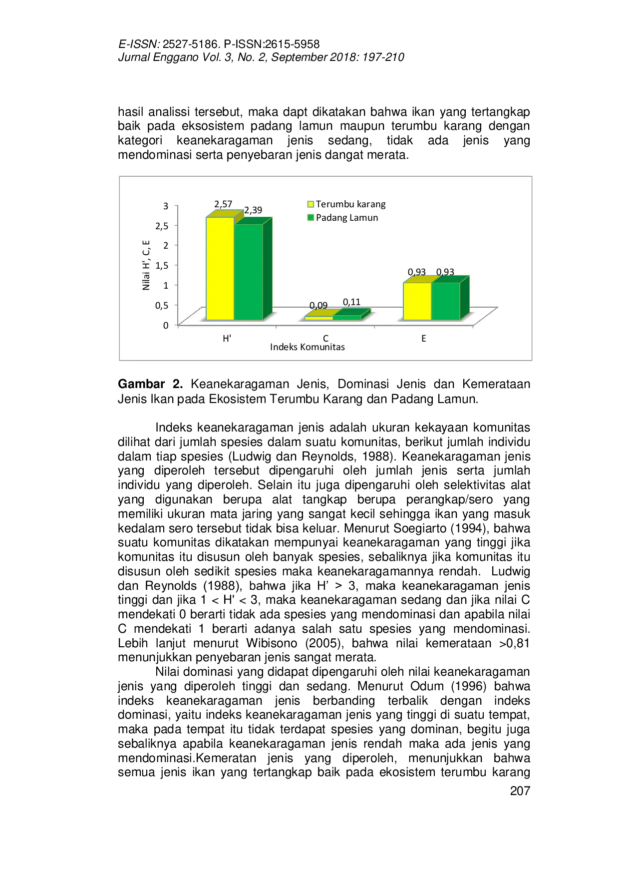 Jurnal EngganoJurnal EngganoPenelitian bertujuan untuk melihat komposisi jenis dan indeks ekologi ikan pada ekosistem lamun dan terumbu karang di Pulau Sibu Kecamatan Oba Utara. Proses penangkapan ikan baik pada ekosistem padang lamun maupun terumbu karang menggunakan jaring insang dengan panjang 50 meter dan lebar 2 meter dan ukuran mesh size 2,5 inchi. Komposisi jenis hasil tangkapan pada ekosistem terumbu karang sebanyak 16 spesies yaitu Tylosurus crocodiles, Cheilio inermis, Gerres oyena, Choerodon robustus, Parupeneus berbirinus, Sillago sihama, Hermigymnus melapterus, Lethrinus erythropterus, Lutjanus decussates, Lutjanus fulvilamma, Lutjanus bengalensis, Siganus canaliculatus, Siganus chrysospilos, Caranx melampygus, Selar boops dan Cephalopholis microprion. Sedangkan pada ekosistem padang lamun sebanyak 13 spesies yaitu Myripristis burndti, Tylosorus strongylurus, Caranx melampygus, Siganus canaliculatus, Siganus chrysospilos, Sillago sihama, Lutjanus ehrenbergii, Lutjanus decussates, Lutjanus fulvilamma, Monotaxis ocellatus, Hermigymnus melapterus dan Sphyraena jello. Keanekaragaman jenis ikan baik pada ekosistem terumbu karang maupun padang lamun tergolong sedang, tidak ada jenis yang mendominasi serta penyebaran jenisnya sangat merata. Hasil tangkapan jenis ikan antara ekosistem terumbu karang dan padang lamun memiliki kemiripan.