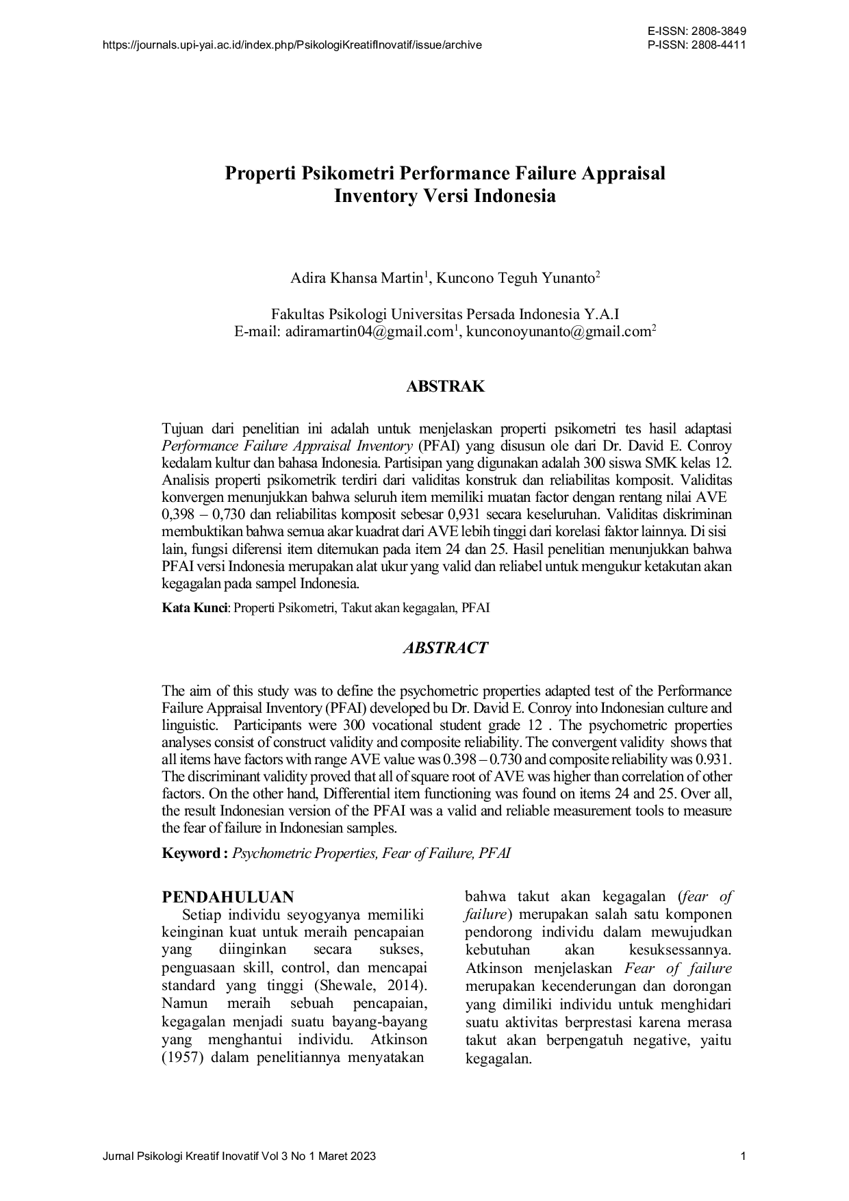 Psikologi Kreatif InovatifPsikologi Kreatif InovatifTujuan penelitian ini adalah untuk menjelaskan properti psikometri tes hasil adaptasi Performance Failure Appraisal Inventory (PFAI) yang disusun oleh Dr. David E. Conroy ke dalam kultur dan bahasa Indonesia. Partisipan yang digunakan adalah 300 siswa SMK kelas 12. Analisis properti psikometrik terdiri dari validitas konstruk dan reliabilitas komposit. Validitas konvergen menunjukkan bahwa seluruh item memiliki muatan faktor dengan rentang nilai AVE 0,398 - 0,730 dan reliabilitas komposit sebesar 0,931 secara keseluruhan. Validitas diskriminan membuktikan bahwa semua akar kuadrat dari AVE lebih tinggi dari korelasi faktor lainnya. Di sisi lain, fungsi diferensi item ditemukan pada item 24 dan 25. Hasil penelitian menunjukkan bahwa PFAI versi Indonesia merupakan alat ukur yang valid dan reliabel untuk mengukur ketakutan akan kegagalan pada sampel Indonesia.
