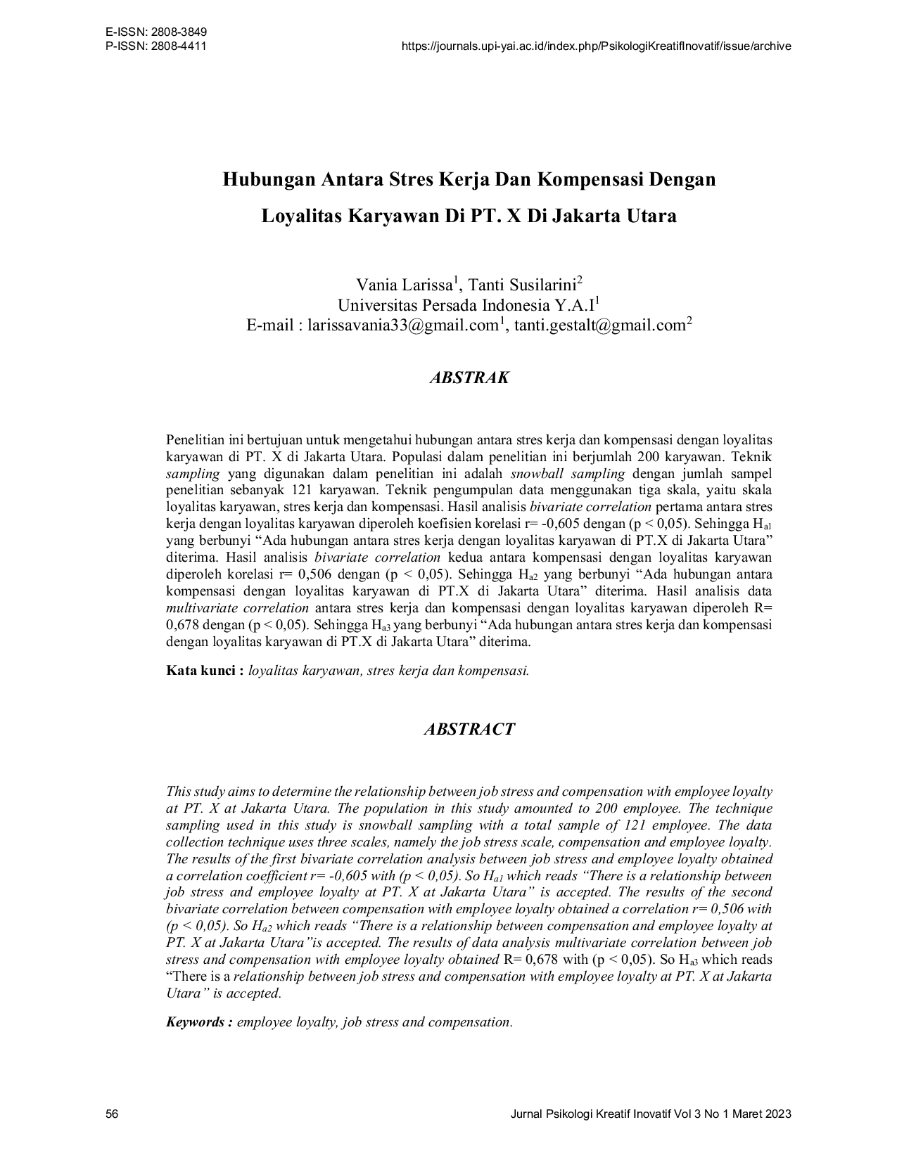 Psikologi Kreatif InovatifPsikologi Kreatif InovatifPenelitian ini bertujuan untuk mengetahui hubungan antara stres kerja dan kompensasi dengan loyalitas karyawan di PT. X di Jakarta Utara. Populasi dalam penelitian ini berjumlah 200 karyawan. Teknik sampling yang digunakan dalam penelitian ini adalah snowball sampling dengan jumlah sampel penelitian sebanyak 121 karyawan. Teknik pengumpulan data menggunakan tiga skala, yaitu skala loyalitas karyawan, stres kerja dan kompensasi. Hasil analisis bivariate correlation pertama antara stres kerja dengan loyalitas karyawan diperoleh koefisien korelasi r= -0,605 dengan (p < 0,05). Sehingga Ha1 yang berbunyi “Ada hubungan antara stres kerja dengan loyalitas karyawan di PT.X di Jakarta Utara diterima. Hasil analisis bivariate correlation kedua antara kompensasi dengan loyalitas karyawan diperoleh korelasi r= 0,506 dengan (p < 0,05). Sehingga Ha2 yang berbunyi “Ada hubungan antara kompensasi dengan loyalitas karyawan di PT.X di Jakarta Utara diterima. Hasil analisis data multivariate correlation antara stres kerja dan kompensasi dengan loyalitas karyawan diperoleh R= 0,678 dengan (p < 0,05). Sehingga Ha3 yang berbunyi “Ada hubungan antara stres kerja dan kompensasi dengan loyalitas karyawan di PT.X di Jakarta Utara diterima.