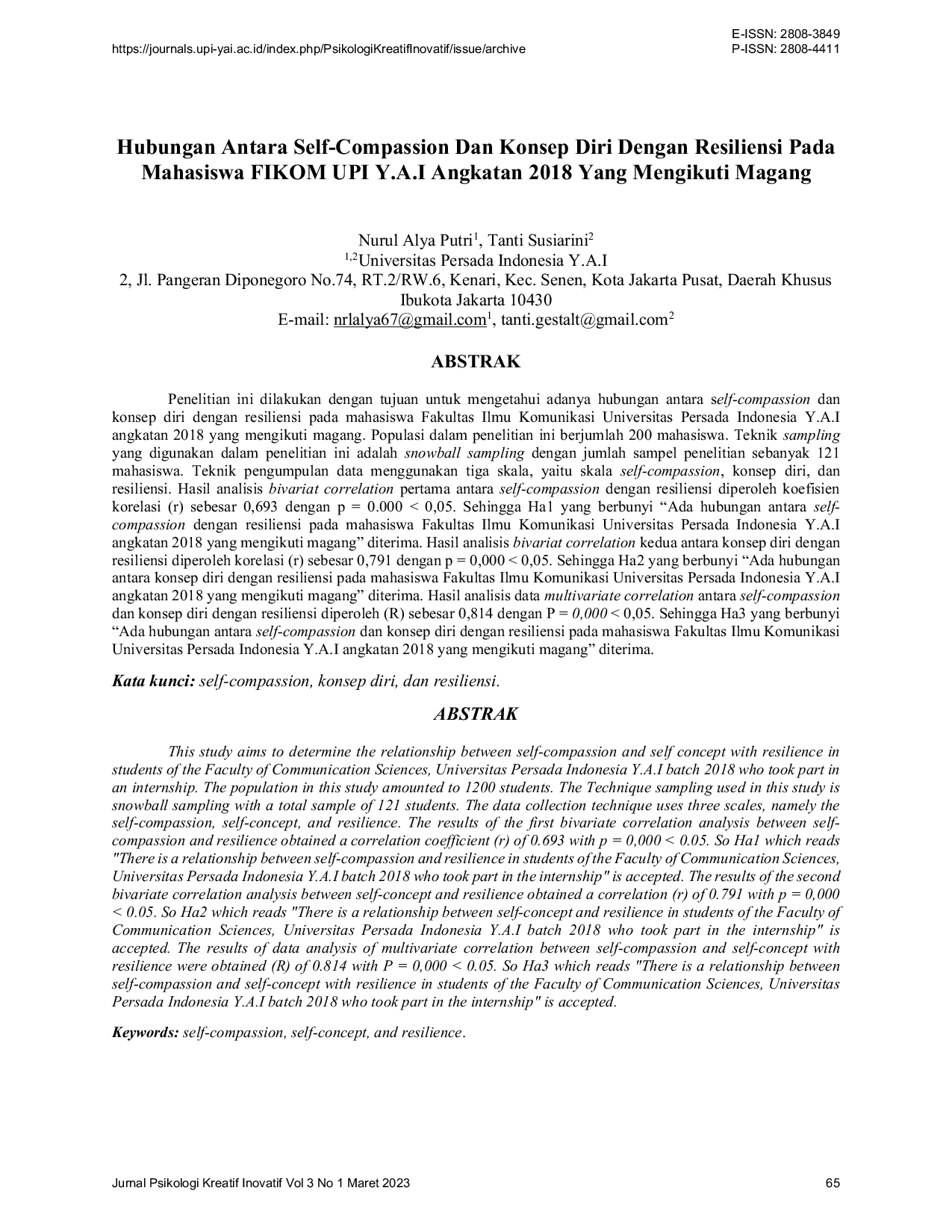 Psikologi Kreatif InovatifPsikologi Kreatif InovatifPenelitian ini bertujuan untuk mengetahui hubungan antara self-compassion dan konsep diri dengan resiliensi pada mahasiswa Fakultas Ilmu Komunikasi Universitas Persada Indonesia Y.A.I angkatan 2018 yang mengikuti magang. Populasi dalam penelitian ini berjumlah 200 mahasiswa. Teknik sampling yang digunakan adalah snowball sampling dengan jumlah sampel penelitian sebanyak 121 mahasiswa. Teknik pengumpulan data menggunakan tiga skala, yaitu skala self-compassion, konsep diri, dan resiliensi. Hasil analisis bivariat correlation pertama antara self-compassion dengan resiliensi diperoleh koefisien korelasi (r) sebesar 0,693 dengan p = 0,000 < 0,05. Hasil analisis bivariat correlation kedua antara konsep diri dengan resiliensi diperoleh korelasi (r) sebesar 0,791 dengan p = 0,000 < 0,05. Hasil analisis data multivariate correlation antara self-compassion dan konsep diri dengan resiliensi diperoleh (R) sebesar 0,814 dengan P = 0,000 < 0,05.