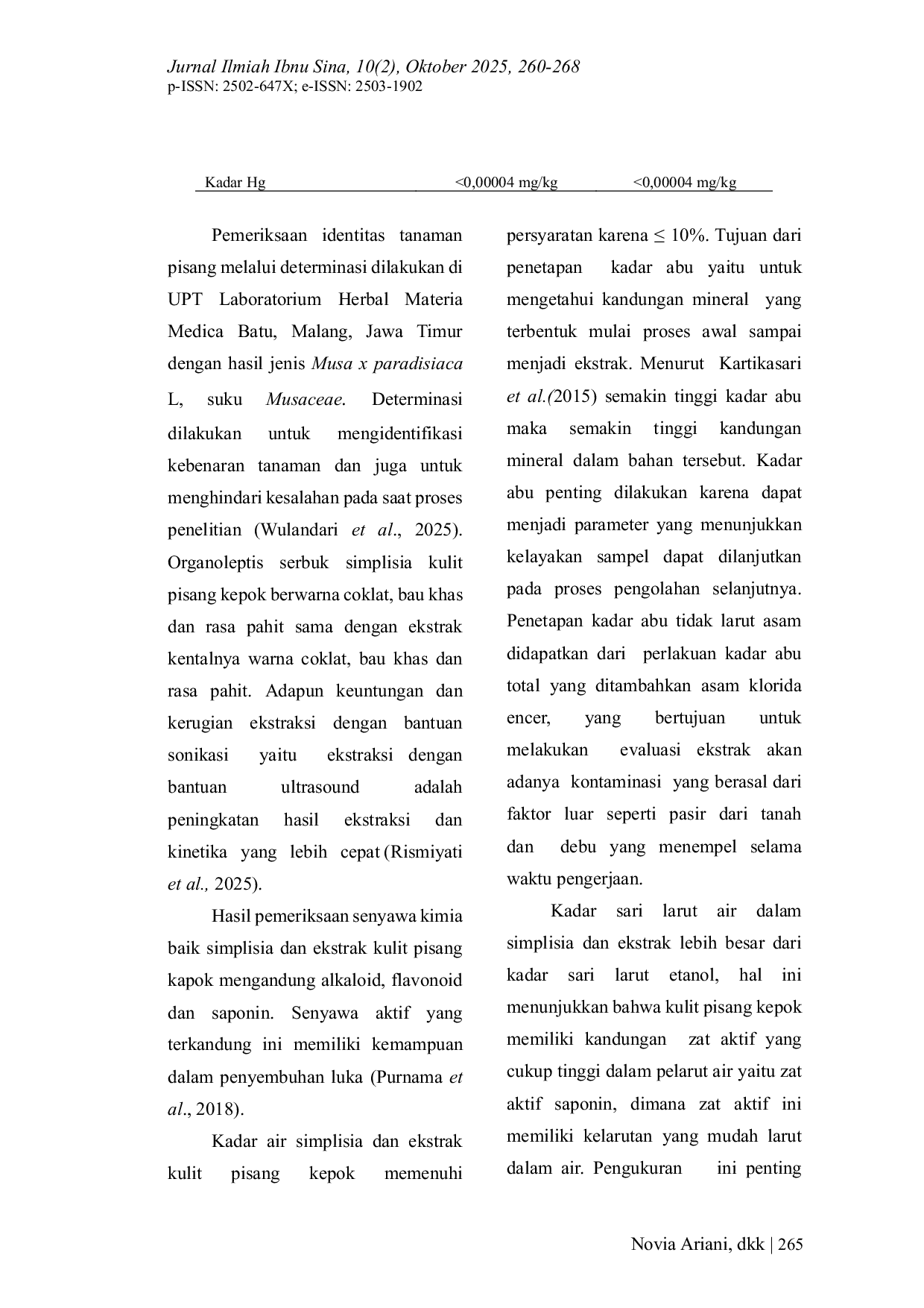 JIIS (Jurnal Ilmiah Ibnu Sina): Ilmu Farmasi dan KesehatanJIIS (Jurnal Ilmiah Ibnu Sina): Ilmu Farmasi dan KesehatanKulit pisang kepok (Musa paradisiaca) merupakan limbah pertanian yang berpotensi besar dimanfaatkan sebagai bahan baku obat tradisional. Berbagai penelitian menunjukkan bahwa kulit pisang kepok mengandung senyawa bioaktif yang berperan sebagai antioksidan, antibakteri, dan mempercepat proses penyembuhan luka. Upaya standardisasi simplisia dan ekstrak diperlukan untuk menjamin mutu, keamanan, dan konsistensi efektivitasnya sebagai fitofarmaka. Penelitian ini bertujuan untuk standarisasi kulit pisang kepok yang meliputi parameter spesifik dan non-spesifik. Metode ekstraksi pada penelitian ini menggunakan sonikasi dengan pelarut etanol 96%. Hasil penelitian menunjukkan kulit pisang kepok memiliki kandungan senyawa aktif berupa alkaloid, flavonoid, dan saponin. Hasil uji standardisasi serbuk simplisia kulit pisang kepok meliputi kadar air, kadar abu, kadar abu tidak larut air, kadar abu tidak larut asam, kadar sari larut etanol, kadar sari larut air, ALT dan AKK serta cemaran logam berat sebesar : 9,34%; 9%; 2,25%; 0,06%; 6,91%; 10,26%;>3,0 x10³cfu/g;5,7 x102;<0,001 mg/kg. Sedangkan standardisasi ekstrak kulit pisang kepok masing-masing sebesar: 9,57%; 11,19%; 0,07%; 0,26%; 21,68%; 22,53%;4,6 x102cfu/g;8,2 x102;<0,001 mg/kg.