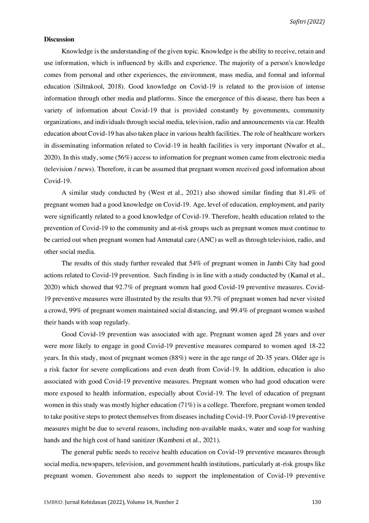 EMBRIO: Jurnal KebidananEMBRIO: Jurnal KebidananCovid-19 merupakan gangguan saluran pernapasan akut yang disebabkan oleh virus SARS-CoV-2 dan telah menjadi pandemi di seluruh dunia. Covid-19 telah menjangkit seluruh penduduk dunia tidak terkecuali ibu hamil. Kerentanan ibu hamil mengalami penyakit infeksi dikarenakan adanya perubahan fisiologi tubuh dan mekanisme respon imun didalam tubuhnya. Salah satu penyebab penularan Covid-19 pada ibu hamil adalah kurangnya pengetahuan terhadap Covid-19 dan pencegahannya. Tujuan penelitian ini adalah untuk mengetahui hubungan pengetahuan dengan tindakan pencegahan Covid-19 pada ibu hamil di Kota Jambi. Penelitian ini merupakan studi observasional analitik dengan rancangan cross-sectional. Populasi dalam penelitian ini adalah seluruh ibu hamil di Kota Jambi, dengan jumlah sampel sebanyak 100 ibu hamil, menggunakan teknik purposive sampling yang memenuhi kriteria inklusi dan tidak termasuk kriteria ekslusi. Pengumpulan data menggunakan kuesioner daring pada bulan Desember 2020 sampai Maret 2021. Analisa data menggunakan uji Chi-Square. Hasil penelitian terdapat hubungan pengetahuan dengan tindakan pencegahan Covid-19 pada ibu hamil di Kota Jambi dengan nilai p-value = 0,001. Dari hasil penelitian ini diharapkan bagi petugas kesehatan dapat memberikan pendidikan kesehatan pencegahan resiko penularan Covid-19 pada kelompok yang berisiko rentan.