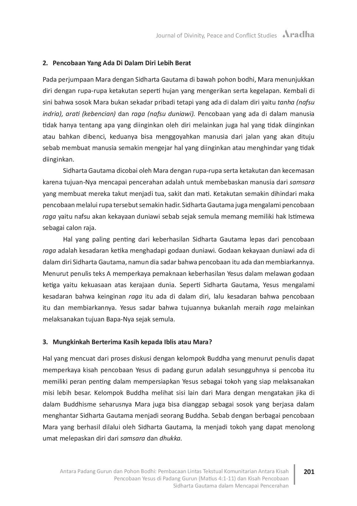Aradha: Journal of Divinity, Peace and Conflict StudiesAradha: Journal of Divinity, Peace and Conflict StudiesPenelitian ini menerapkan metode hermeneutika lintas tekstual komunitarian untuk mengeksplorasi perjumpaan antara agama Kristen dan Buddhisme di Asia, khususnya melalui perbandingan dua narasi sakral: kisah pencobaan Yesus di Padang Gurun (Matius 4:1-11) dan kisah pencobaan Sidharta Gautama sebelum mencapai pencerahan. Metode ini menghubungkan teks-teks dari tradisi agama yang berbeda, menciptakan ruang untuk saling memperkaya makna. Artikel ini menunjukkan bagaimana pembacaan lintas tekstual komunitarian yang melibatkan partisipasi kedua komunitas Kristen dan Buddhis dalam menafsirkan teks-teks tersebut sehingga dapat menawarkan wawasan baru tentang tema-tema bersama, seperti pencobaan dan pencerahan spiritual. Perbandingan antara kisah pencobaan Yesus dan Sidharta Gautama mengungkapkan perjuangan psikologis dan spiritual yang serupa, seperti godaan untuk tunduk pada keinginan. Dengan mengintegrasikan kedua teks ini, penelitian ini tidak hanya memperkaya penafsiran terhadap teks Alkitab, tetapi juga mendorong dialog antaragama antara komunitas Kristen dan Buddhis, yang memungkinkan pemahaman yang lebih dalam tentang perjalanan spiritual masing-masing tradisi serta implikasinya terhadap dialog antaragama.