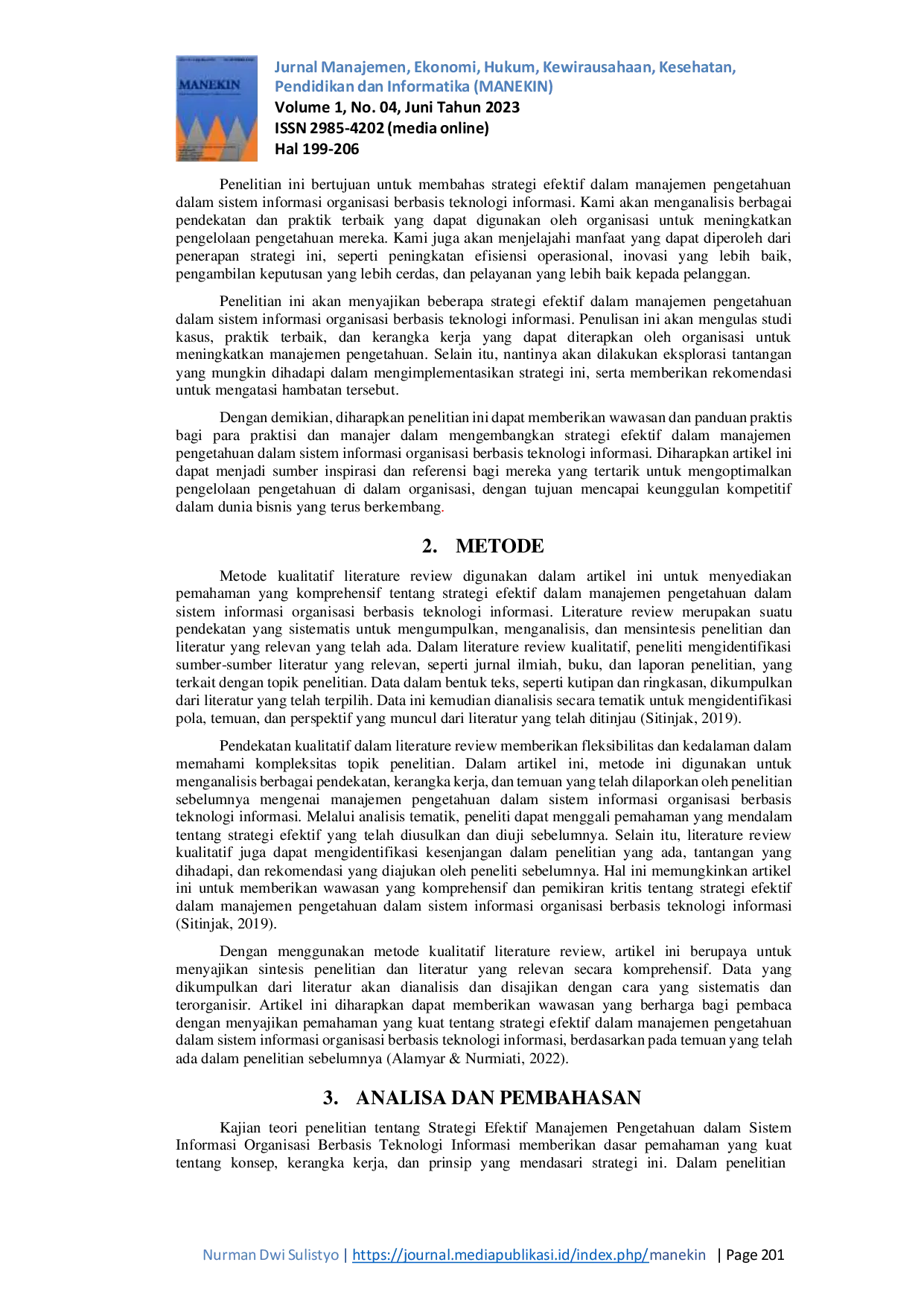Jurnal Manajemen, Ekonomi, Hukum, Kewirausahaan, Kesehatan, Pendidikan dan Informatika (MANEKIN)Jurnal Manajemen, Ekonomi, Hukum, Kewirausahaan, Kesehatan, Pendidikan dan Informatika (MANEKIN)Pengetahuan yang efektif dalam mengelola pengetahuan dalam sistem informasi organisasi berbasis teknologi informasi adalah suatu tantangan yang kompleks. Dalam menghadapi perubahan yang cepat dan persaingan yang ketat, organisasi perlu mengadopsi strategi yang tepat untuk mengoptimalkan penggunaan pengetahuan dalam konteks sistem informasi berbasis teknologi. Tujuan dari penelitian ini adalah untuk melakukan literature review menggunakan metode kualitatif dalam memahami . Metode kualitatif literature review digunakan untuk mengumpulkan, menganalisis, dan mensintesis penelitian dan literatur yang relevan yang telah ada. Hasil dari literature review ini mengungkapkan bahwa melibatkan beberapa aspek kunci. Pertama, pengelolaan pengetahuan yang efisien melibatkan identifikasi pengetahuan yang relevan dan strategis, pengorganisasian pengetahuan, serta pemanfaatan teknologi informasi untuk memfasilitasi akses dan berbagi pengetahuan di seluruh organisasi. Selain itu, pemanfaatan teknologi informasi yang tepat dalam sistem informasi organisasi berbasis teknologi informasi juga menjadi elemen penting dalam strategi ini. Penggunaan basis data pengetahuan, platform kolaborasi, dan sistem informasi terintegrasi memungkinkan organisasi untuk mengelola dan menyebarkan pengetahuan secara efektif.