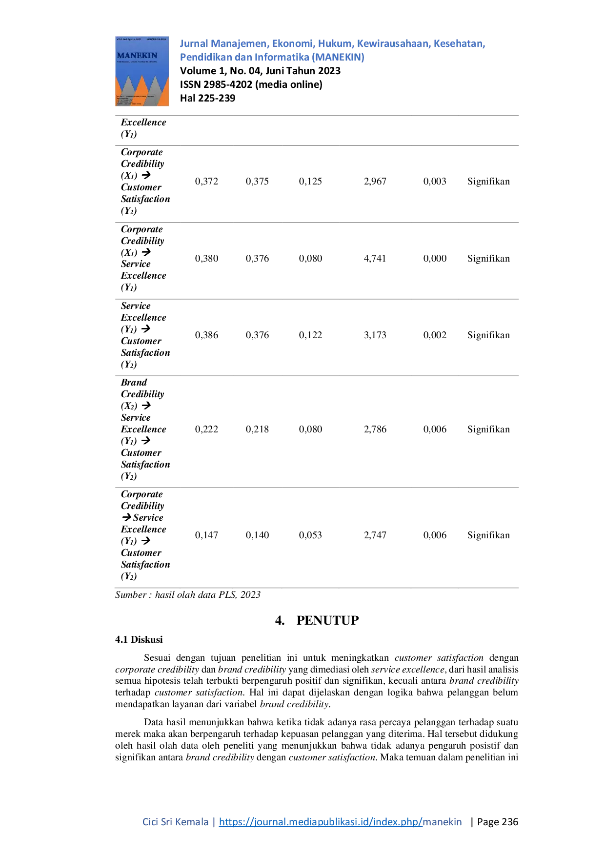 Berdasarkan penelitian ini, dapat disimpulkan bahwa persepsi pelanggan mengenai kredibilitas suatu perusahaan atau merek tidak cukup kuat untuk memberikan kepuasan kepada pelanggan.Oleh karena itu, penting untuk membangun kredibilitas suatu merek untuk menciptakan rasa puas pada pelanggan.Lebih lanjut, pelayanan prima yang diberikan oleh suatu perusahaan dapat membantu memberikan kepuasan pada pelanggan.Dengan demikian, perusahaan perlu fokus pada peningkatan kualitas layanan untuk meningkatkan kepuasan pelanggan.