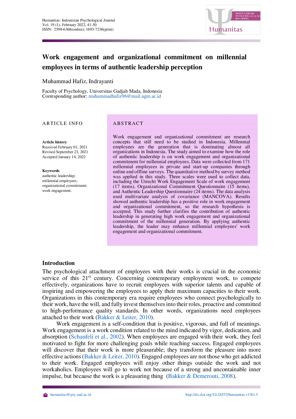 - Work engagement and organizational commitment on millennial employees in terms of authentic leadership... journal1.uad.ac.id/index.php/Humanitas/article/view/5Work engagement and organizational commitment on millennial employees in terms of authentic leadership journal1 uad ac index php Humanitas article view 5