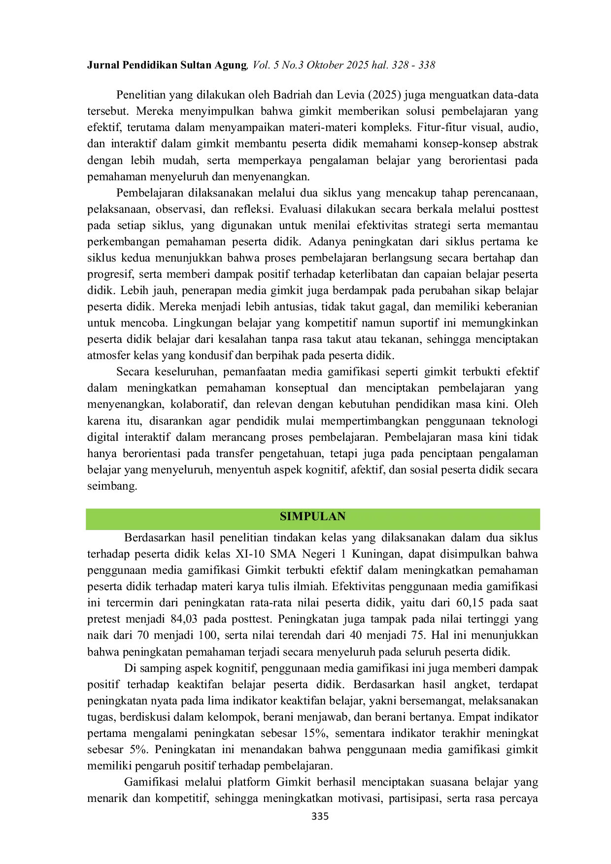 Jurnal Pendidikan Sultan AgungJurnal Pendidikan Sultan AgungPenelitian ini bertujuan untuk meningkatkan pemahaman peserta didik terhadap materi karya tulis ilmiah dan keaktifan belajar melalui penggunaan media gimkit dalam pembelajaran Bahasa Indonesia. Penelitian ini menggunakan metode tindakan kelas dengan pendekatan kuantitatif dan kualitatif yang dilaksanakan dalam dua siklus pada kelas XI-10. Teknik pengumpulan data meliputi tes pilihan ganda, observasi, angket, dan dokumentasi. Analisis data dilakukan secara kuantitatif melalui perhitungan nilai rata-rata dan persentase ketuntasan, serta kualitatif melalui reduksi data, penyajian data, dan penarikan kesimpulan. Hasil penelitian menunjukkan adanya peningkatan signifikan pada pemahaman peserta didik yang ditandai dengan kenaikan rata-rata nilai dari 60,15 pada prasiklus menjadi 84,03 setelah perlakuan. Peningkatan juga terjadi pada nilai tertinggi dari 70 menjadi 100 dan nilai terendah dari 40 menjadi 75. Selain itu, hasil angket dan observasi menunjukkan adanya peningkatan pada indikator keaktifan belajar seperti bersemangat, menjawab pertanyaan, bertanya, berdiskusi, dan melaksanakan tugas, dengan peningkatan persentase keaktifan mencapai lebih dari 85%. Dengan demikian, penggunaan media gimkit terbukti efektif dalam meningkatkan pemahaman dan keaktifan belajar peserta didik pada pembelajaran Bahasa Indonesia.