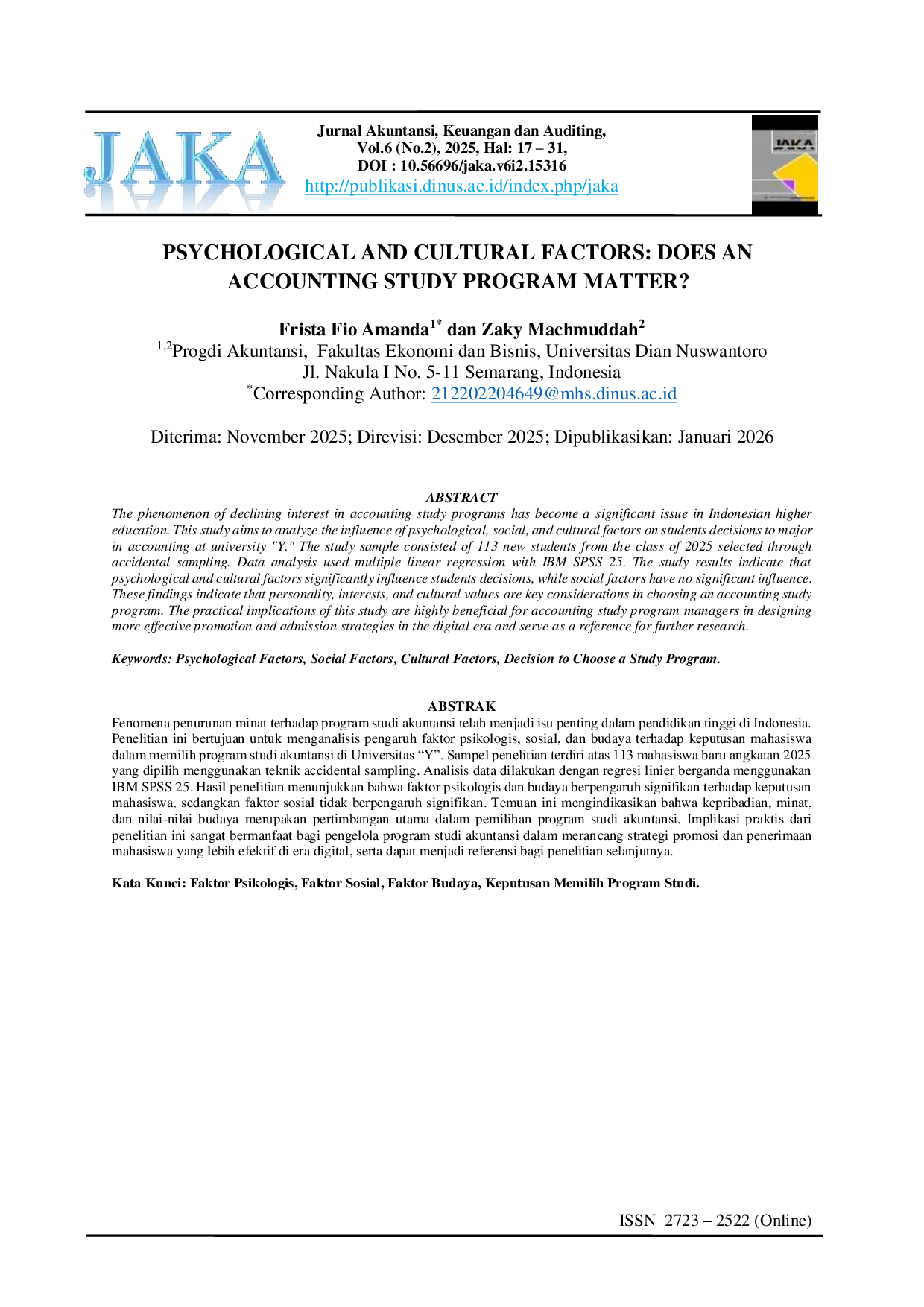 JAKA (Jurnal Akuntansi, Keuangan, dan Auditing)JAKA (Jurnal Akuntansi, Keuangan, dan Auditing)Fenomena penurunan minat terhadap program studi akuntansi telah menjadi isu penting dalam pendidikan tinggi di Indonesia. Penelitian ini bertujuan untuk menganalisis pengaruh faktor psikologis, sosial, dan budaya terhadap keputusan mahasiswa dalam memilih program studi akuntansi di Universitas “Y. Sampel penelitian terdiri atas 113 mahasiswa baru angkatan 2025 yang dipilih menggunakan teknik accidental sampling. Analisis data dilakukan dengan regresi linier berganda menggunakan IBM SPSS 25. Hasil penelitian menunjukkan bahwa faktor psikologis dan budaya berpengaruh signifikan terhadap keputusan mahasiswa, sedangkan faktor sosial tidak berpengaruh signifikan. Temuan ini mengindikasikan bahwa kepribadian, minat, dan nilai-nilai budaya merupakan pertimbangan utama dalam pemilihan program studi akuntansi. Implikasi praktis dari penelitian ini sangat bermanfaat bagi pengelola program studi akuntansi dalam merancang strategi promosi dan penerimaan mahasiswa yang lebih efektif di era digital, serta dapat menjadi referensi bagi penelitian selanjutnya.
