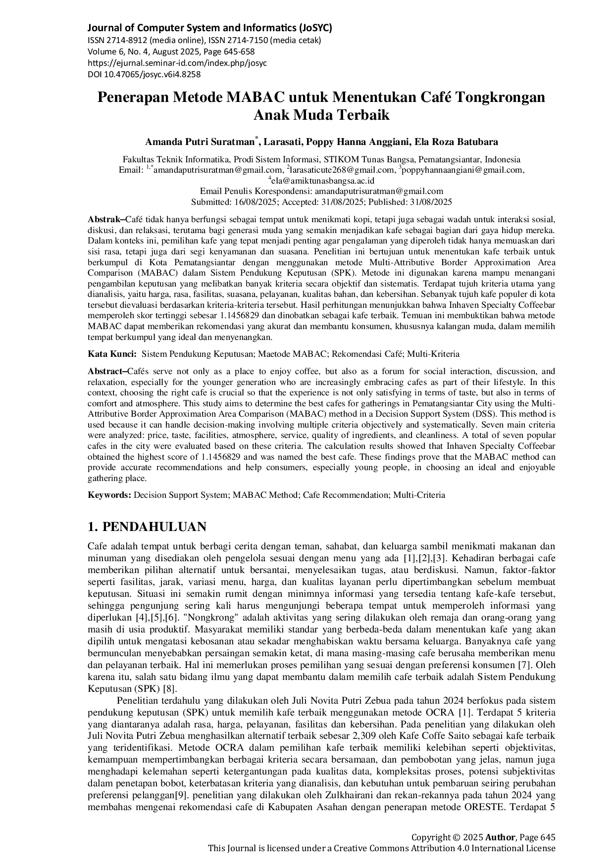Kesimpulan dari penelitian ini menunjukkan bahwa penggunaan metode Multi-Attributive Border Approximation Area Comparison (MABAC) dalam Sistem Pendukung Keputusan (SPK) efektif untuk menentukan kafe terbaik di Kota Pematangsiantar secara objektif, terukur, dan menyeluruh.Melalui keterlibatan tujuh kriteria utama—harga, rasa makanan dan minuman, fasilitas, suasana, pelayanan, kualitas bahan, dan kebersihan—penelitian ini berhasil memberikan penilaian yang komprehensif terhadap tujuh kafe populer.Dari hasil perhitungan yang dilakukan secara bertahap dan sistematis, Inhaven Specialty Coffebar memperoleh skor tertinggi sebesar 1.Penerapan metode MABAC terbukti mampu menyederhanakan proses pengambilan keputusan multi-kriteria dengan memberikan pembobotan yang transparan serta menghasilkan peringkat alternatif yang dapat diandalkan.Proses perhitungan mulai dari normalisasi data, pembentukan matriks perbatasan, hingga analisis jarak terhadap area aproksimasi dilakukan dengan pendekatan kuantitatif yang sistematik.Namun demikian, penelitian ini memiliki sejumlah keterbatasan, seperti ukuran sampel yang relatif kecil serta potensi subjektivitas dalam pemberian bobot kriteria.Untuk pengembangan selanjutnya, disarankan agar mempertimbangkan lebih banyak alternatif dan menambahkan kriteria yang lebih relevan dengan tren konsumen masa kini, seperti keberadaan Wi-Fi gratis, ruang kerja, atau praktik ramah lingkungan.Temuan ini diharapkan dapat menjadi acuan penting bagi konsumen dalam memilih tempat berkumpul serta bagi pelaku usaha dalam meningkatkan kualitas layanan.