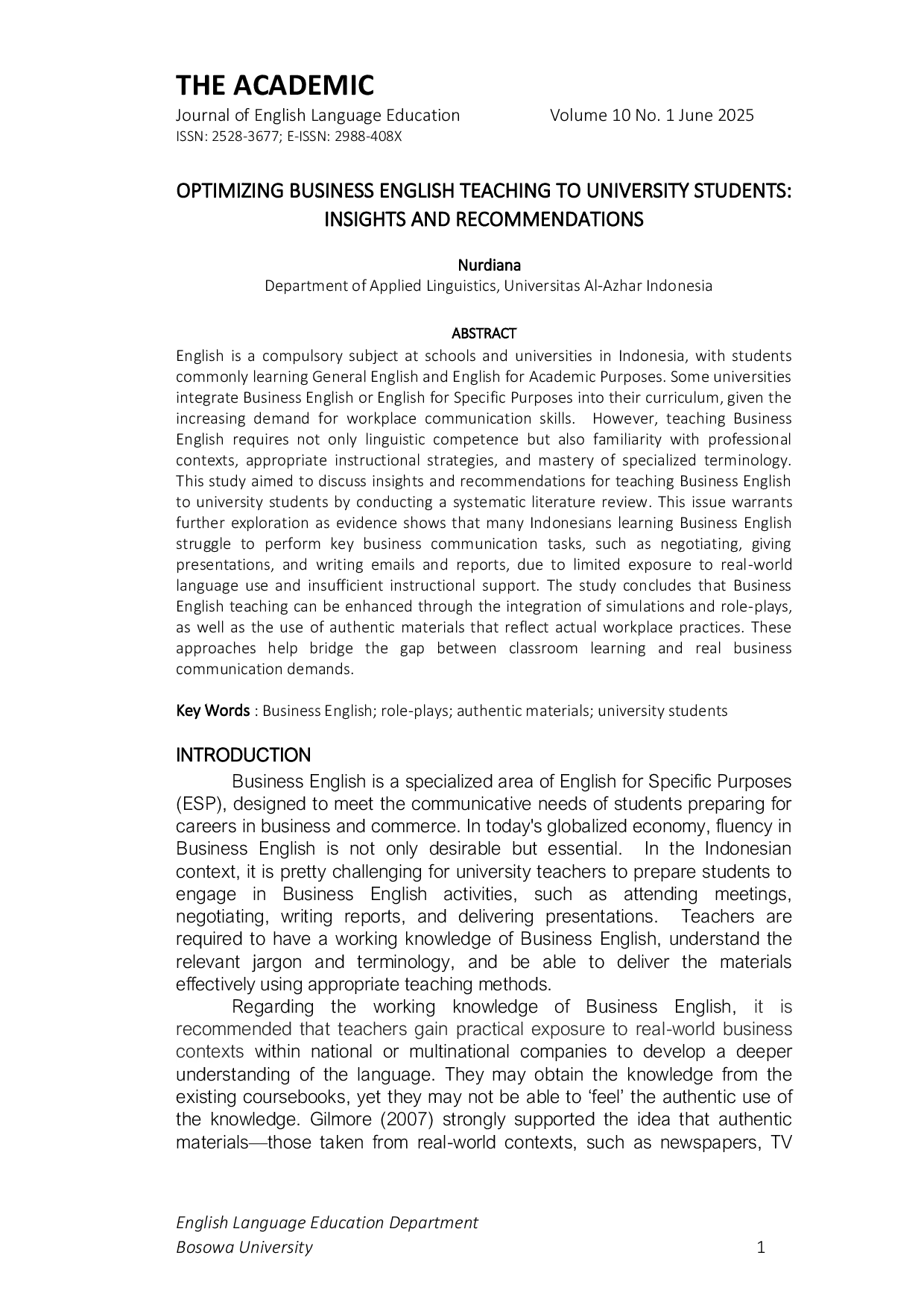 THE ACADEMIC: ENGLISH LANGUAGE LEARNING JOURNALTHE ACADEMIC: ENGLISH LANGUAGE LEARNING JOURNALBahasa Inggris merupakan mata pelajaran wajib di sekolah dan universitas di Indonesia, dengan siswa umumnya mempelajari Bahasa Inggris Umum dan Bahasa Inggris untuk Tujuan Akademik. Beberapa universitas mengintegrasikan Bahasa Inggris Bisnis atau Bahasa Inggris untuk Tujuan Khusus ke dalam kurikulum mereka, mengingat meningkatnya permintaan akan keterampilan komunikasi di tempat kerja. Namun, mengajar Bahasa Inggris Bisnis memerlukan tidak hanya kompetensi linguistik tetapi juga keakraban dengan konteks profesional, strategi instruksional yang tepat, dan penguasaan terminologi khusus. Studi ini bertujuan untuk membahas wawasan dan rekomendasi untuk mengajar Bahasa Inggris Bisnis kepada mahasiswa dengan melakukan tinjauan literatur sistematis. Isu ini memerlukan eksplorasi lebih lanjut karena bukti menunjukkan bahwa banyak orang Indonesia yang belajar Bahasa Inggris Bisnis kesulitan dalam melakukan tugas-tugas komunikasi bisnis utama, seperti bernegosiasi, memberikan presentasi, dan menulis email dan laporan, karena paparan terbatas terhadap penggunaan bahasa dunia nyata dan dukungan instruksional yang tidak memadai. Studi ini menyimpulkan bahwa pengajaran Bahasa Inggris Bisnis dapat ditingkatkan melalui integrasi simulasi dan bermain peran, serta penggunaan materi otentik yang mencerminkan praktik kerja nyata. Pendekatan ini membantu menjembatani kesenjangan antara pembelajaran di kelas dan tuntutan komunikasi bisnis dunia nyata.