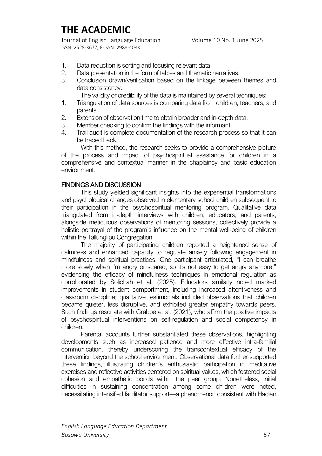 Based on the empirical findings, it can be concluded that the psychospiritual mentoring model implemented for elementary school children within the Tallunglipu Congregation effectively enhances their mental well-being.The integration of mindfulness practices and spiritual values, tailored to the local cultural milieu, facilitates childrens capacity to manage stress and anxiety, fosters inner tranquility, and reinforces harmonious social interactions within both educational and congregational settings.The sustained success and efficacy of the program are contingent upon the proactive involvement of teachers and parents, who constitute pivotal components of the childs support system.