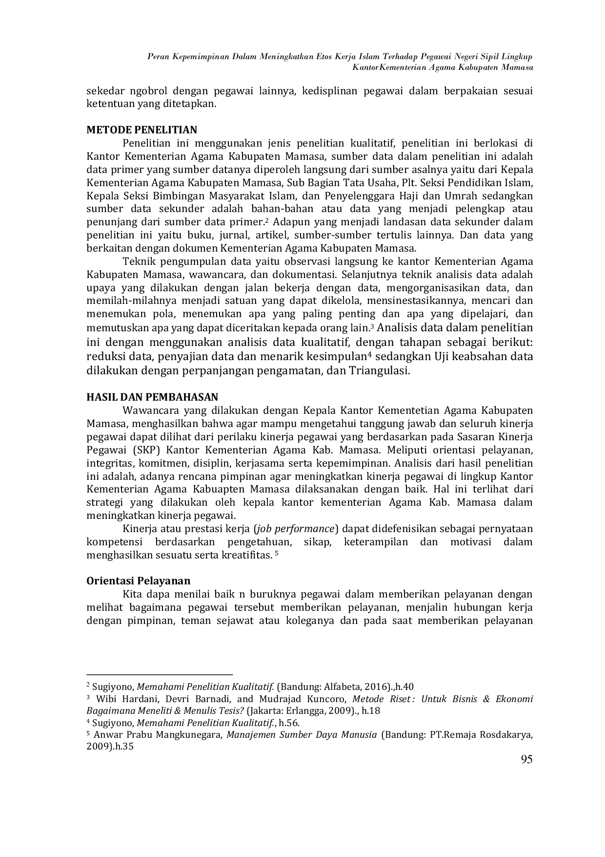 Mabny: Journal of Sharia Management and BusinessMabny: Journal of Sharia Management and BusinessTujuan penelitian ini untuk mendeskripsikan peran kepemimpinan dalam meningkatkan etos kerja Islam terhadap pegawai negeri sipil lingkup Kementerian Agama Kabupaten Mamasa. Jenis penelitian yang digunakan dalam penelitian ini adalah lapangan atau field research, sedangkan sifat penelitian bersifat deskriptif, Penelitian teknik pengumpulan data dengan wawancara dan dokumentasi. Wawancara, sumber data yang peneliti gunakan yaitu sumber data primer dan sumber data sekunder, adapun yang menjadi sumber data primer yakni kepada Kepala Kementerian Agama Kabupaten Mamasa, Sub Bagian Tata Usaha, dan Plt. Seksi Pendidikan Islam, Kepala Seksi Bimbingan Masyarakat Islam dan Penyelenggara Haji dan Umrah. Hasil penelitian yang dilakukan oleh peneliti, kepemimpinan yang ada di Kementerian Agama Kab. Mamasa secara keseluruhan sudak cukup memenuhi dari indikator-indikator serta fungsi kepemimpinan berdampak pada etos kerja pegawai yaitu menjadi lebih bersemangat dalam menjalankan tugas maupun pekerjaan yang diberikan serta berpengaruh pada tanggung jawab kepada Kementerian Agama Kab. Mamasa sehingga dapat bekerja secara maksimal dan mencapai tujuan bersama yang ditetapkan oleh Kementerian Agama Kab. Mamasa.