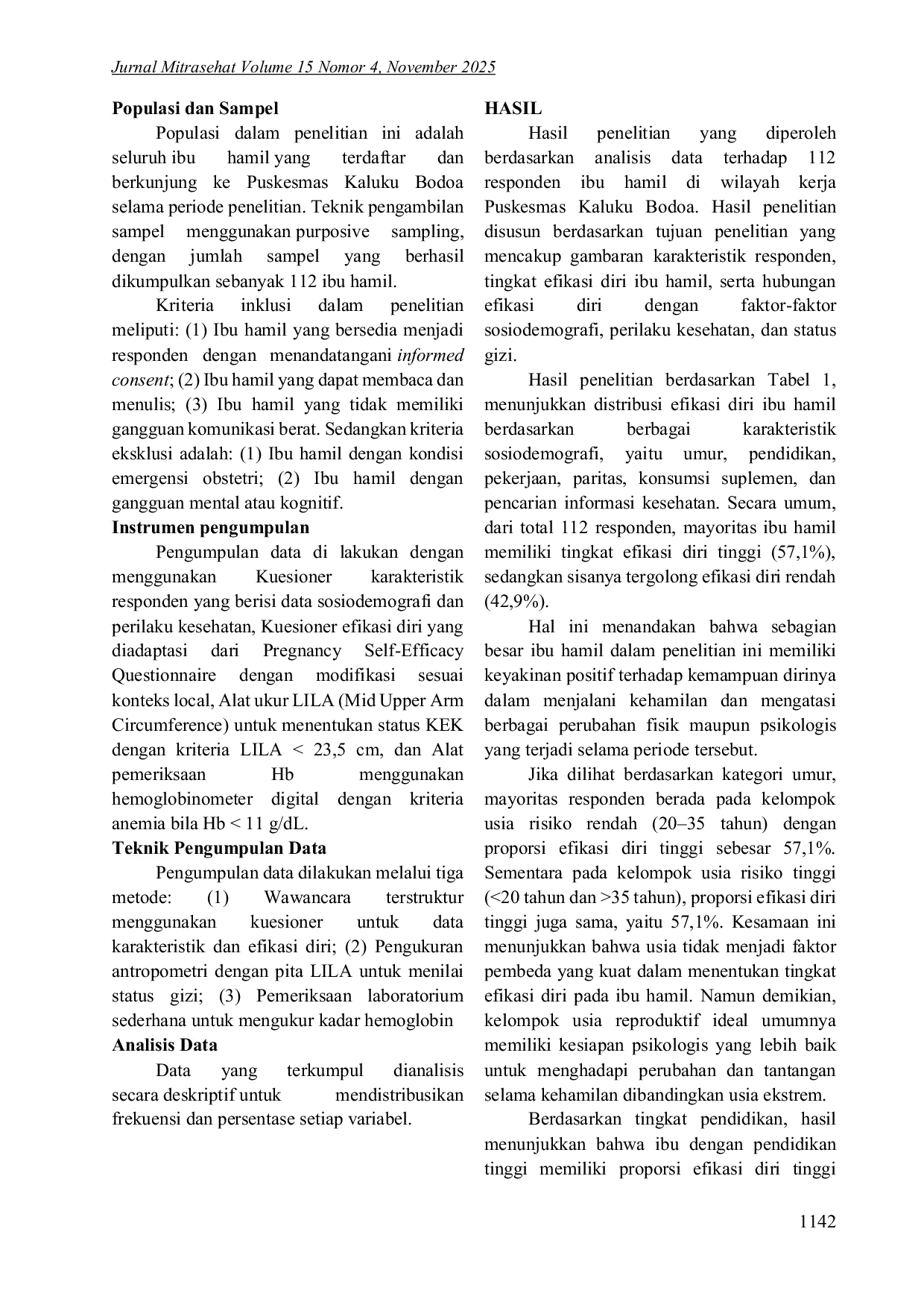 Jurnal MitrasehatJurnal MitrasehatLatar Belakang: Efikasi diri merupakan keyakinan individu dalam mengelola situasi, termasuk pada ibu hamil. Tingginya prevalensi anemia (48,9%) dan KEK (17,5%) pada ibu hamil di Indonesia diduga berkaitan dengan aspek psikologis ini. Tujuan: Menggambarkan distribusi efikasi diri ibu hamil berdasarkan karakteristik sosiodemografi dan status kesehatan di Wilayah Kerja Puskesmas Kaluku Bodoa. Metode: Penelitian deskriptif, menggunakan purposive sampling melibatkan 112 ibu hamil pada Maret-Mei 2024. Pengumpulan data menggunakan kuesioner, pengukuran LILA, dan pemeriksaan hemoglobin. Analisis data menggunakan statistik deskriptif. Hasil: Sebanyak 57,1% responden memiliki efikasi diri tinggi. Proporsi tertinggi ditemukan pada ibu berpendidikan tinggi (66,2%), wiraswasta (75,0%), primigravida (59,5%), serta kelompok yang tidak mengonsumsi suplemen (67,6%) dan aktif mencari informasi kesehatan (59,2%). Status KEK lebih tinggi pada kelompok efikasi diri tinggi (32,8% vs 22,9%), namun prevalensi anemia lebih rendah pada kelompok tersebut (23,4% vs 29,2%). Kesimpulan: Mayoritas ibu hamil memiliki efikasi diri tinggi dengan variasi berdasarkan karakteristik tertentu. Diperlukan intervensi terintegrasi dalam layanan antenatal untuk meningkatkan efikasi diri melalui konseling dan edukasi kesehatan berbasis digital.