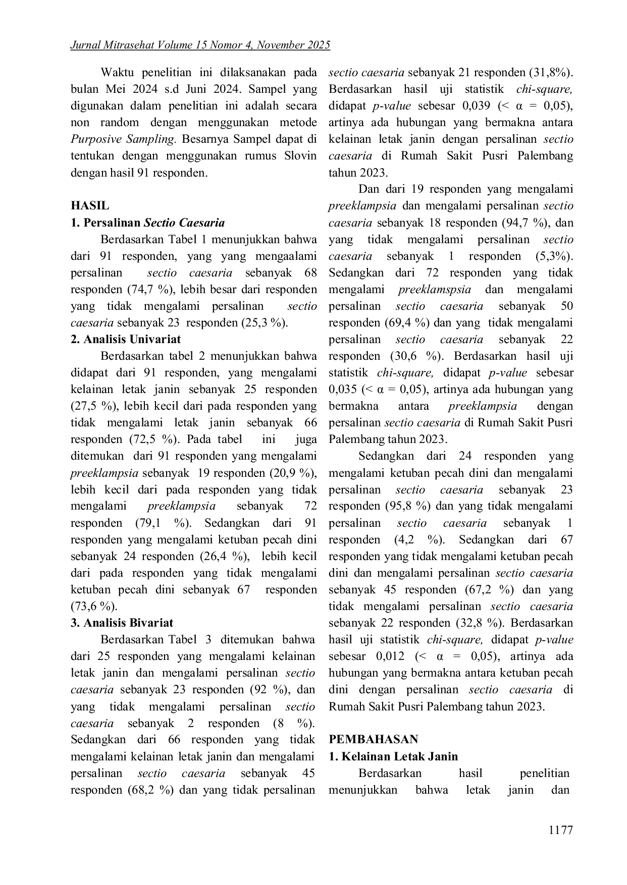 Jurnal MitrasehatJurnal MitrasehatLatar belakang: Persalinan Sectio Caesaria (SC) adalah proses persalinan dengan jalan pembedahan dinding perut dan dinding rahim untuk mengeluarkan janin dan plasentanya. Persalinan dengan Sectio Caesaria ini dilakukan atas indikasi medis baik dari ibu dan janin, seperti Placenta prevea presentasi atau letak abnormal pada janin, serta indikasi lainnya yang dapat membahayakan nyawa ibu maupun janin. Tujuan: hubungan kelainan letak Janin, preeklamsia dan ketuban pecah dini dengan Persalinan Sectio Caesarea Di Rumah Sakit Pusri Palembang Tahun 2023.