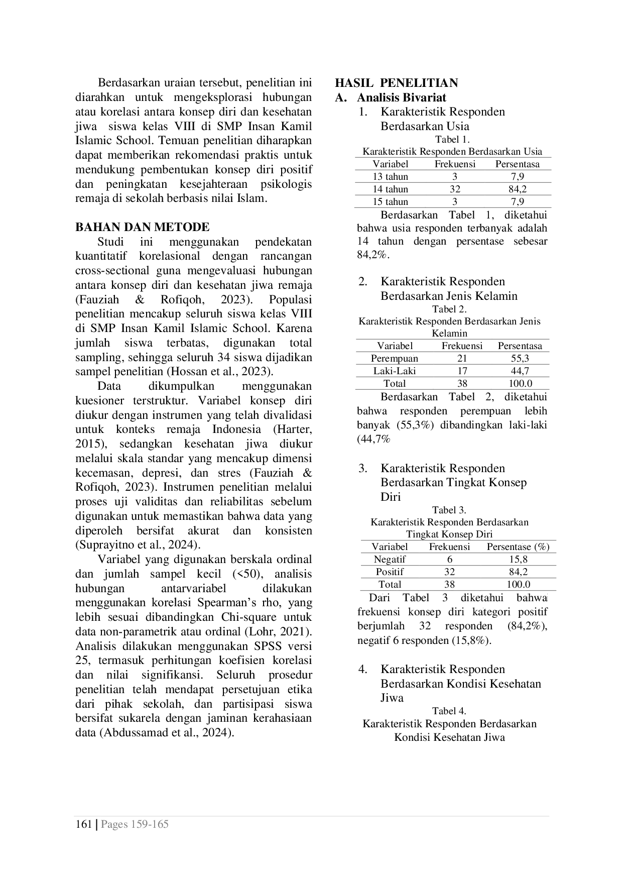 Jurnal Riset Media KeperawatanJurnal Riset Media KeperawatanMasa remaja merupakan periode penting dalam pembentukan kepribadian dan keseimbangan emosional seseorang. Kesehatan jiwa di usia ini sangat menentukan kemampuan individu untuk menyesuaikan diri, mengelola perasaan, serta menjalin hubungan sosial secara sehat. Konsep diri merupakan salah satu faktor yang mendukung kesejahteraan mental remaja. Studi ini dilakukan untuk mengidentifikasi adanya keterhubungan antara variabel konsep diri dengan variabel kesehatan jiwa pada remaja yang bersekolah di SMP Insan Kamil Islamic School. Penelitian menggunakan pendekatan kuantitatif dengan rancangan korelasional. Sampel diambil secara total sampling sebanyak 38 siswa kelas VIII. Alat ukur yang dipakai dalam proses pengumpulan data pada studi ini adalah kuesioner konsep diri serta kuesioner kesehatan jiwa juga sudah melewati tahapan uji validitas dan reliabilitas. Uji Spearman Rank digunakan untuk menganalisis data karena data tidak terdistribusi normal dan data memiliki skala ordinal. Analisis ini mengindikasikan adanya keterkaitan positif yang berkorelasi antara konsep diri dan kesehatan jiwa remaja dengan nilai p = 0,000. Remaja dengan konsep diri positif biasanya menunjukkan kestabilan mental yang lebih baik, mampu beradaptasi dengan baik, serta memiliki keseimbangan emosi yang lebih baik. Terdapat korelasi yang signifikan. Diperlukan dukungan sekolah melalui pembinaan karakter dan program konseling Islami untuk memperkuat konsep diri positif peserta didik sehingga kesehatan jiwanya dapat meningkat.