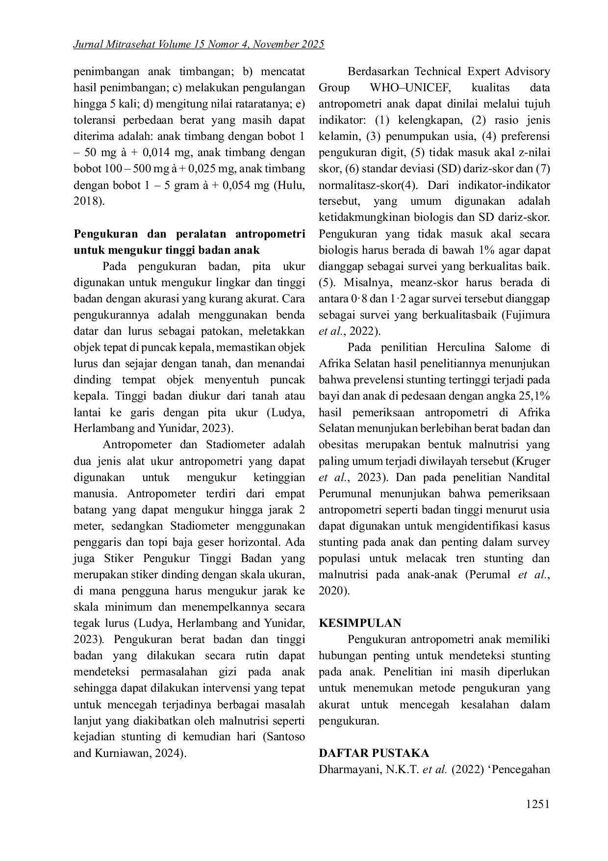 Jurnal MitrasehatJurnal MitrasehatLatar belakang: Stunting adalah masalah gizi kronis yang banyak ditemukan pada anak di Indonesia. Prevalensi stunting pada anak di Indonesia mencapai 32,8%. Meskipun telah banyak upaya dilakukan, angka stunting masih tinggi. Tujuan: Penelitian ini bertujuan membandingkan literatur tentang pengukuran antropometri untuk mendeteksi kasus stunting pada anak.