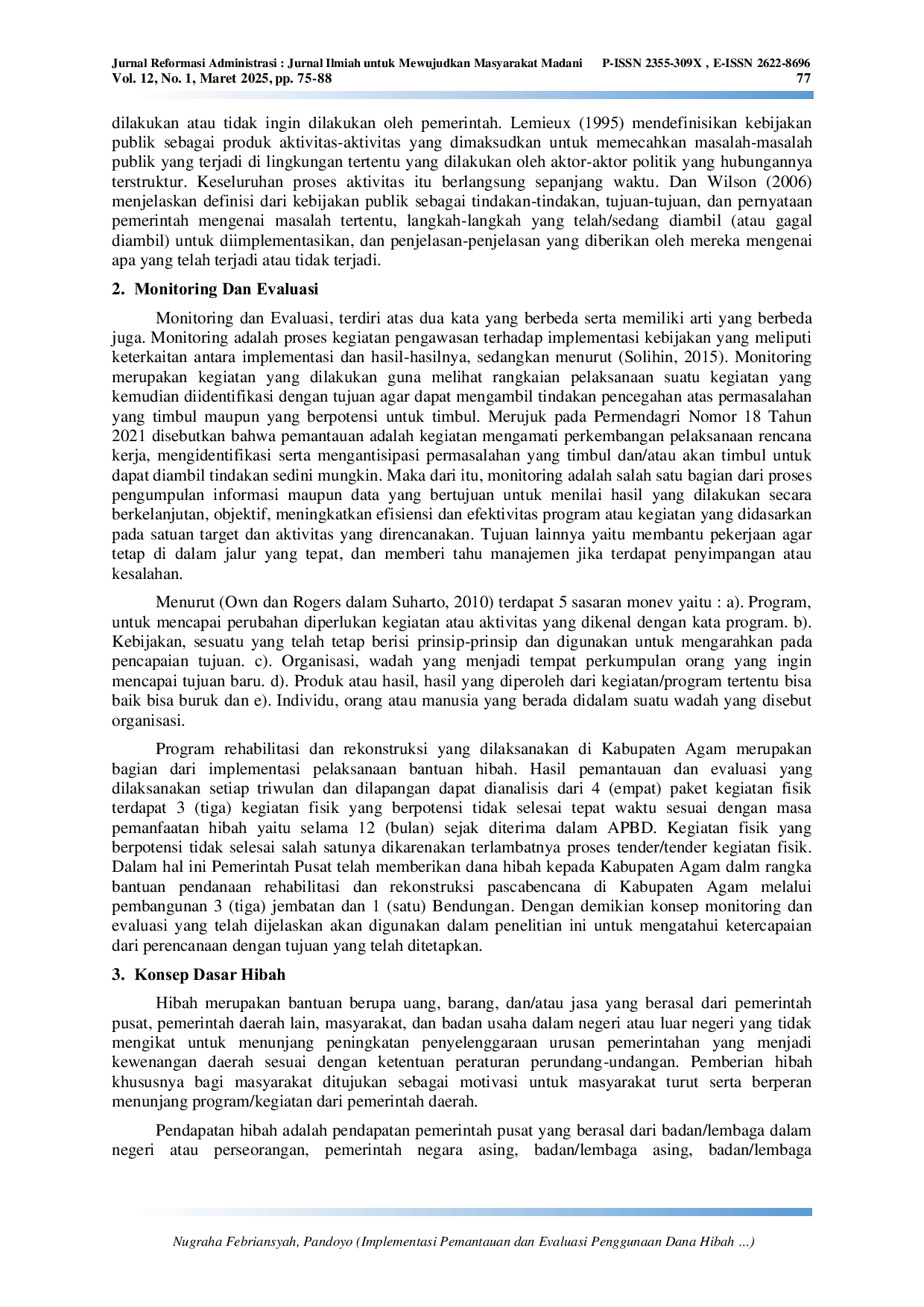 Reformasi AdministrasiReformasi AdministrasiKabupaten Agam merupakan salah satu wilayah dengan intensitas bencana tinggi yang berdampak pada aspek material dan non‑material, sehingga diperlukan rehabilitasi dan rekonstruksi pascabencana. Permasalahan dalam penelitian ini adalah pengelolaan dana hibah di Kabupaten Agam belum dikelola secara optimal. Penelitian ini bertujuan untuk mengkaji pemantauan dan evaluasi pelaksanaan penggunaan dana hibah rehabilitasi dan rekonstruksi di Kabupaten Agam pada tahun 2022. Teori yang digunakan adalah teori evaluasi Dunn yang mencakup perencanaan, pelaksanaan, dan pelaporan. Metode yang diterapkan bersifat kualitatif dengan pendekatan studi kasus. Teknik analisis data mengacu pada Cresswell & Cresswell (2018) yang meliputi proses mengorganisir dan menyiapkan data, membaca seluruh data, melakukan coding, menghasilkan deskripsi dan tema, merepresentasikan deskripsi serta tema, dan melakukan interpretasi. Hasil penelitian menunjukkan bahwa pemantauan dan evaluasi penggunaan dana hibah rehabilitasi dan rekonstruksi di Kabupaten Agam tahun 2022 dilaksanakan melalui perencanaan, pelaksanaan, dan pelaporan. Namun, pelaksanaan penggunaan dana hibah tidak dapat dioptimalkan karena keterbatasan waktu penggunaan dana hibah. Faktor pendukung dan penghambat kebijakan terdiri dari faktor internal dan eksternal. Rekomendasi penelitian ini adalah memperkuat komitmen para pemangku kepentingan, memperkuat koordinasi lintas sektoral, serta meningkatkan transparansi dan akuntabilitas.