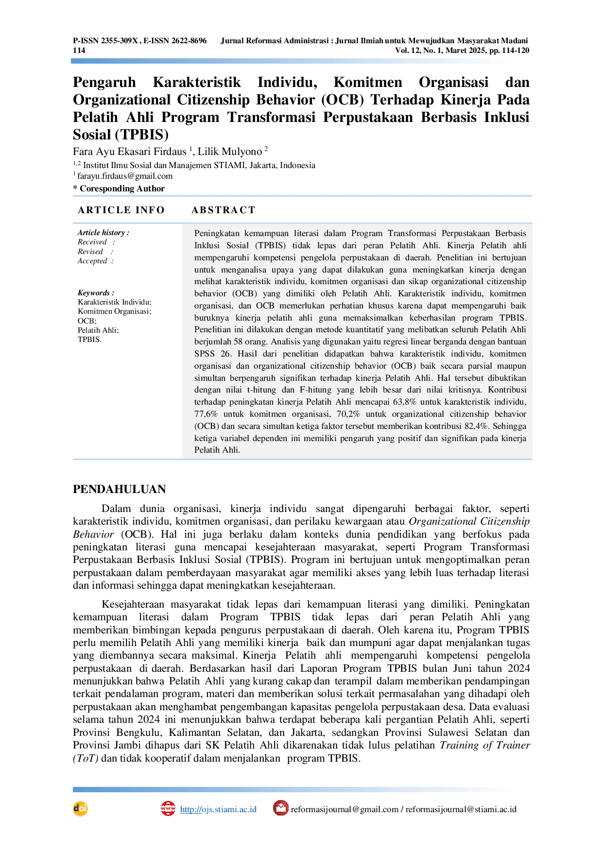 Reformasi AdministrasiReformasi AdministrasiPeningkatan kemampuan literasi dalam Program Transformasi Perpustakaan Berbasis Inklusi Sosial (TPBIS) tidak lepas dari peran Pelatih Ahli. Kinerja Pelatih ahli mempengaruhi kompetensi pengelola perpustakaan di daerah. Penelitian ini bertujuan untuk menganalisa upaya yang dapat dilakukan guna meningkatkan kinerja dengan melihat karakteristik individu, komitmen organisasi dan sikap organizational citizenship behavior (OCB) yang dimiliki oleh Pelatih Ahli. Karakteristik individu, komitmen organisasi, dan OCB memerlukan perhatian khusus karena dapat mempengaruhi baik buruknya kinerja pelatih ahli guna memaksimalkan keberhasilan program TPBIS.