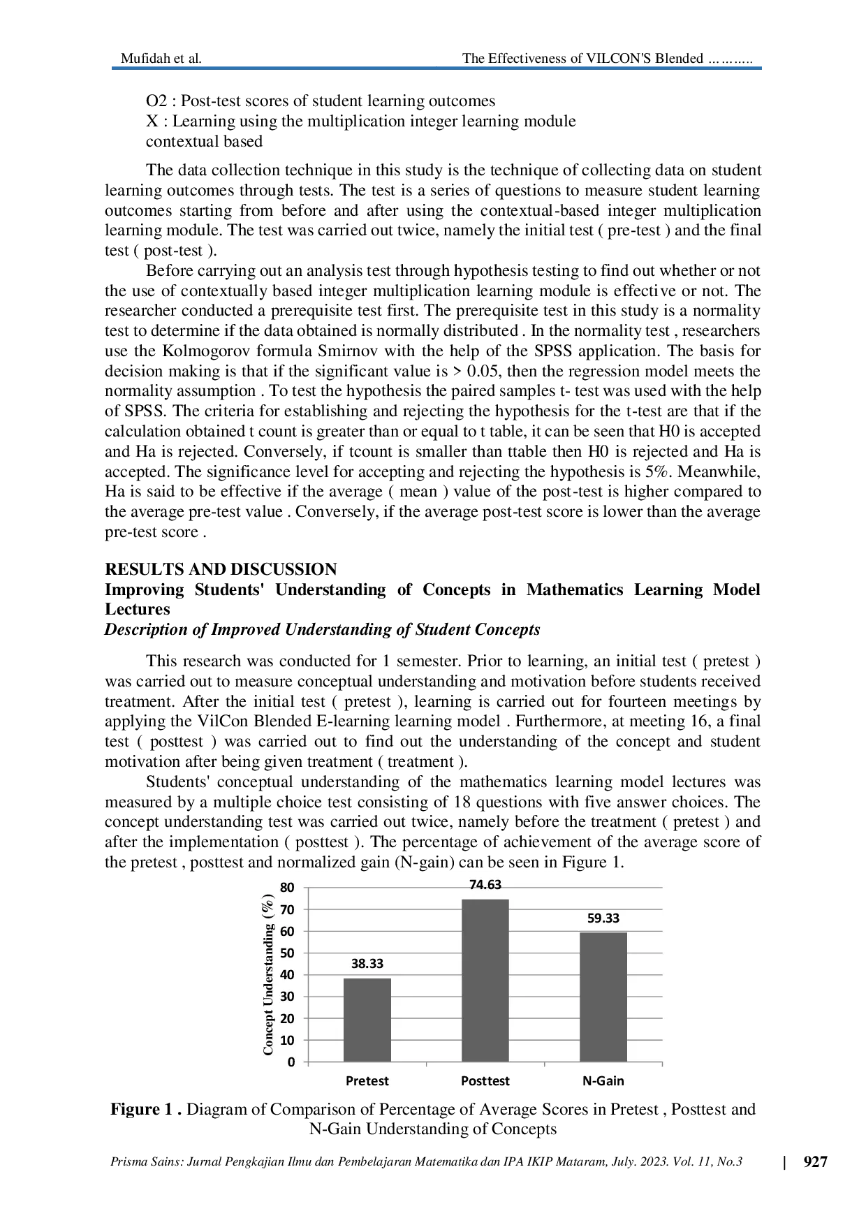 Prisma Sains : Jurnal Pengkajian Ilmu dan Pembelajaran Matematika dan IPA IKIP MataramPrisma Sains : Jurnal Pengkajian Ilmu dan Pembelajaran Matematika dan IPA IKIP MataramAlong with the development of existing technology, the implementation of internet use for learning, one of which is e-learning, has become increasingly prevalent. The Covid-19 pandemic necessitated online learning. This online learning is not separate from the same learning objectives. As partners and facilitators, lecturers are required to select and process the learning process, thus necessitating consideration of appropriate learning models that align with the characteristics of students. The selection of the learning model used influences the quality and yield of learning. This study aimed to test the effectiveness of the ViLCon blended e-learning model, which has been developed for both offline and online learning, to ensure learning is effective and efficient, thereby achieving the studys objectives. This research employed a quasi-experimental design, specifically a one-group pre-test post-test design. The validity and reliability of the tests used were analyzed using SPSS. A validity test was conducted on 40 students in class A using a double-choice question instrument. The average pre-test score for understanding the material before learning was 38.33% of the ideal score, while the average post-test score was 74.63% of the ideal score. The significant improvement from the pre-test to post-test scores is represented by a normalized gain of 0.59, categorized as medium according to Hake (1999). This indicates that the use of the VilCon Blended E-learning model is effective in increasing students understanding of mathematical learning models. Based on the analysis of the results and discussions, it can be concluded that the VilCon Blended E-Learning module is effective in improving learning outcomes and motivation among PGSD students at Tadulako University.